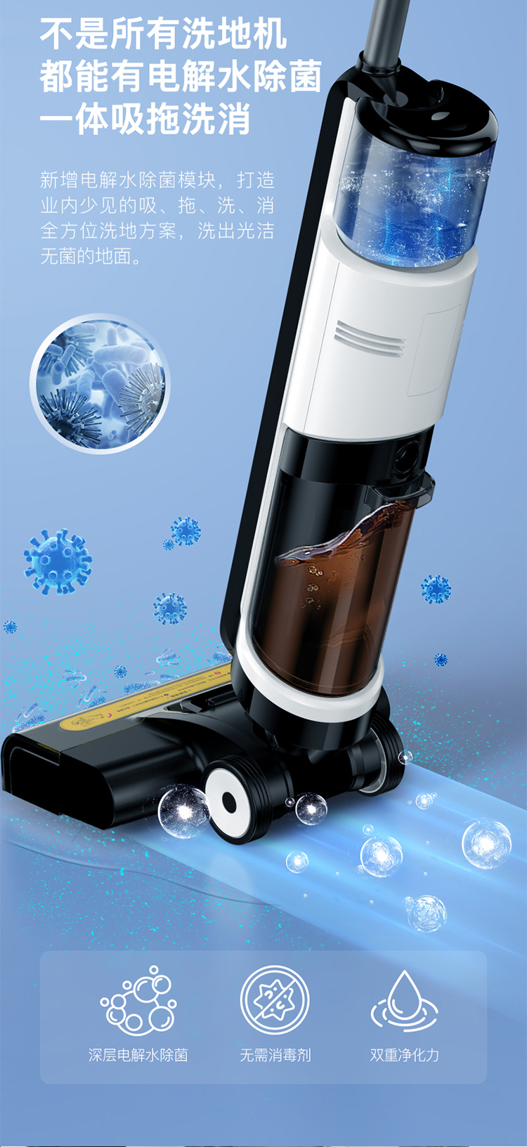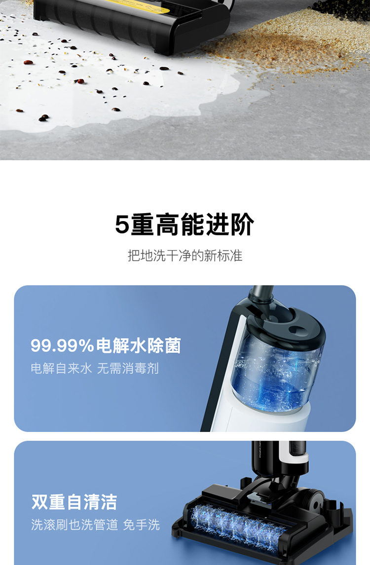 拥有实时电解水杀菌功能,无需添加任何化学药剂,电解后的水对地面进行深度清洁的同时整机除菌率99.9%,让清洁效果得到进一步提升,在疫情不断反复的当下,这种安全无残留的杀菌方式可以更好的守护家人的安全。
