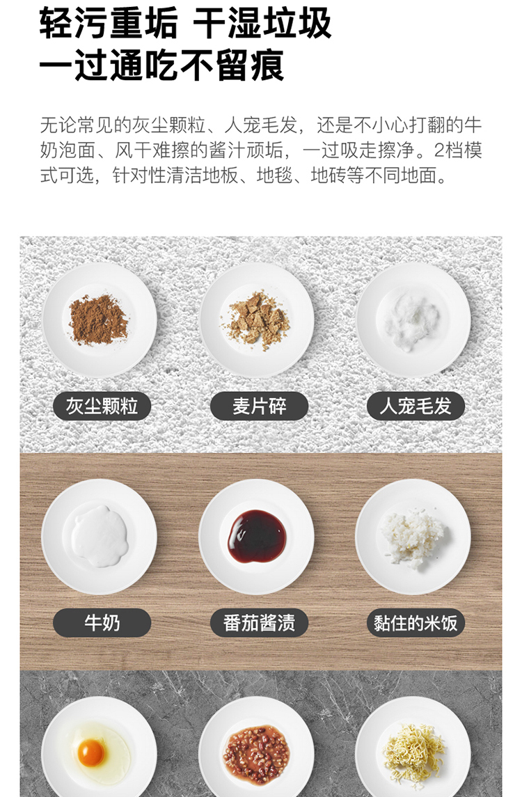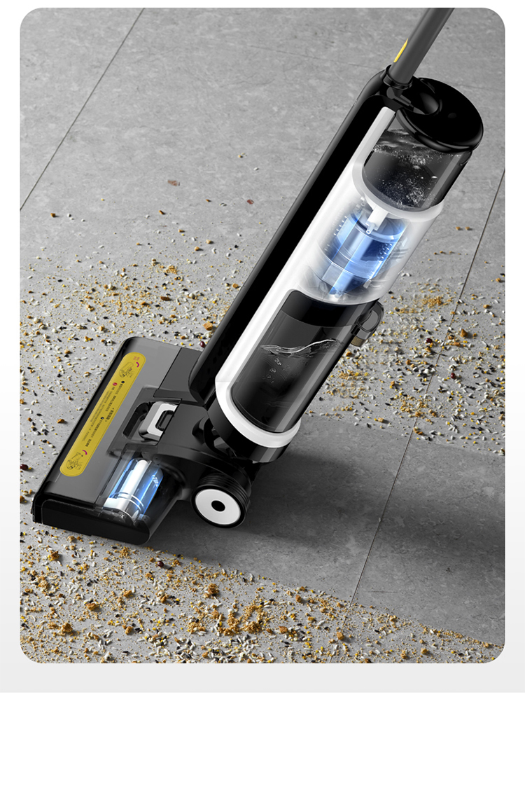 和常见的扫地机器人或手持吸尘器相比,洗地机的优势在于,它集合了吸尘、拖地、洗地、除菌等多种功能于一体,能够同步实现多重清洁任务。适用于瓷砖、硬地板、短毛地毯等不同材质地面,干湿垃圾都能吸,而且可以应对一些顽固的污渍;为了更好的清理边角,地刷采用贴边设计,贴边使用时不存在清理死角。
