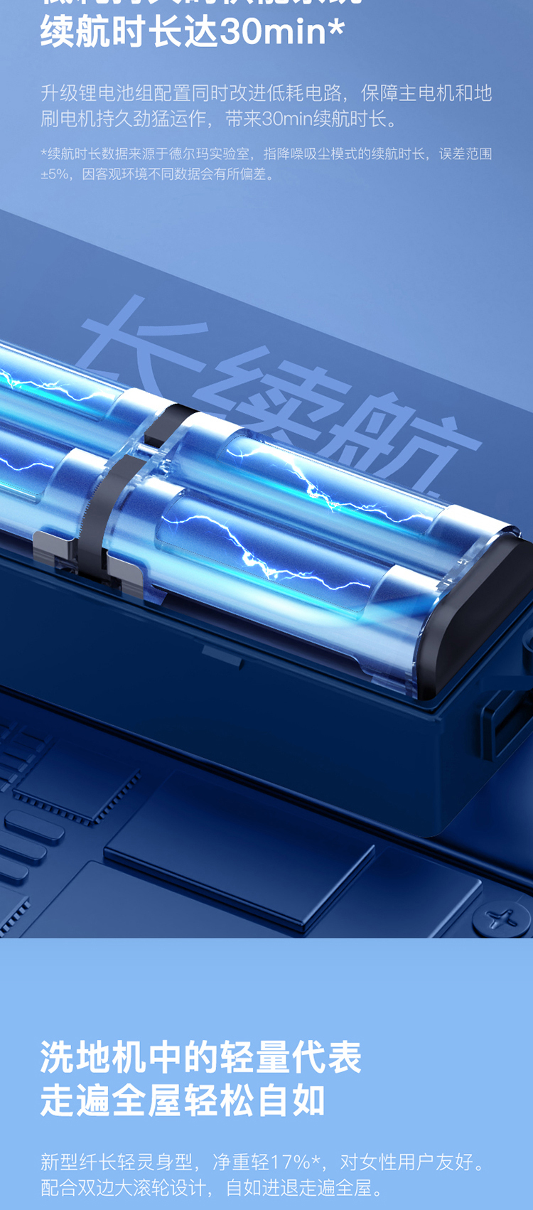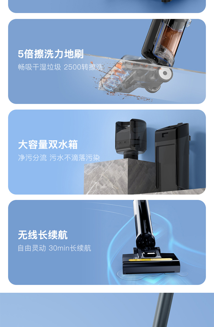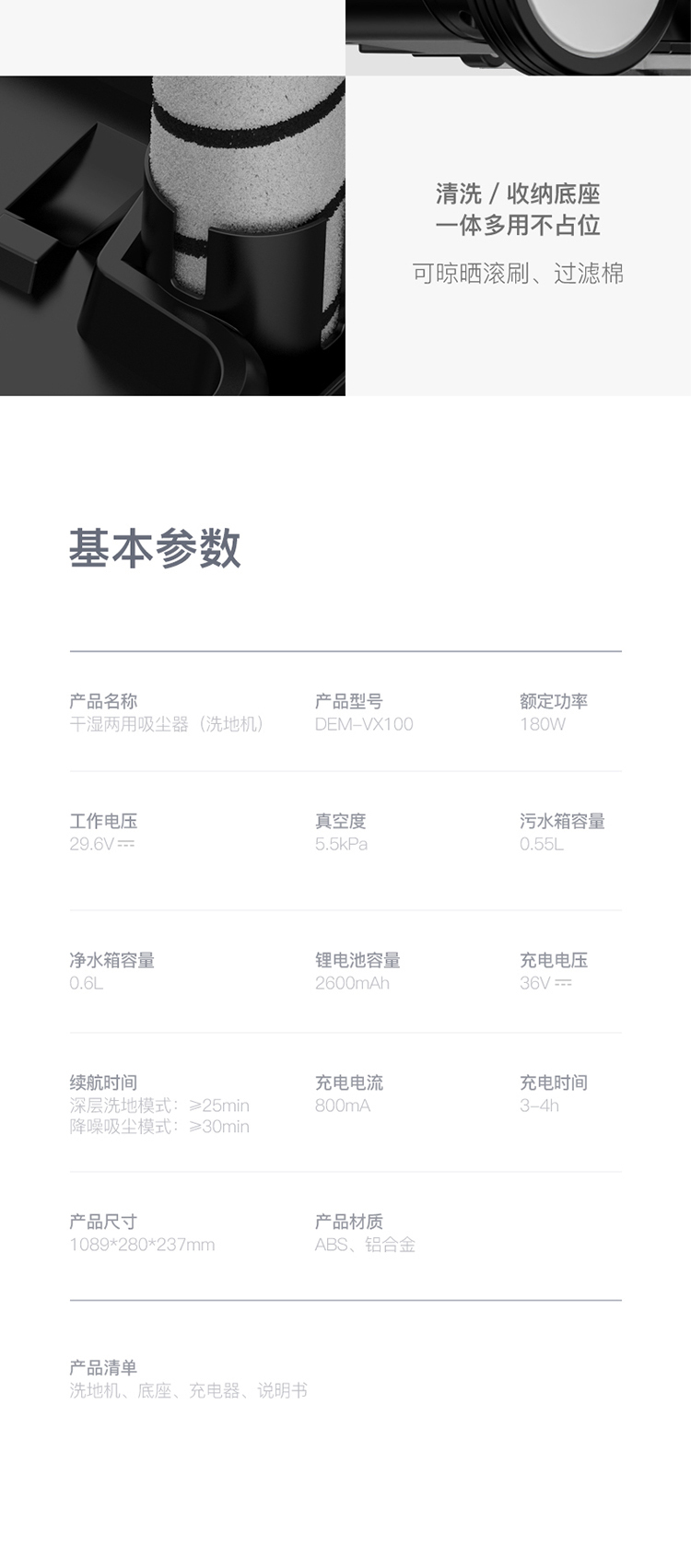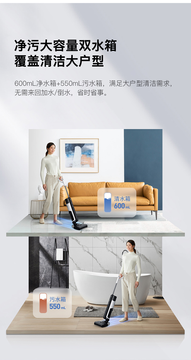 600mL净水箱+550ml污水箱,无需来回加水/倒水,省时省事,内置3600毫安锂电池,保障主电机和地刷电机持久劲猛运作,带来30min续航时长,满足大户型清洁需求,一体清洁、收纳底座,可晾晒滚刷、过滤棉,一体多用不占地。
