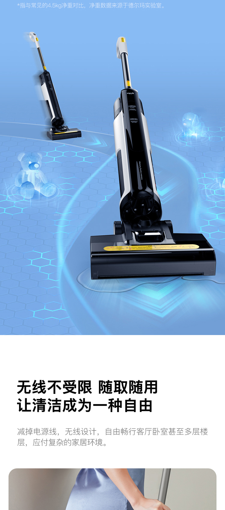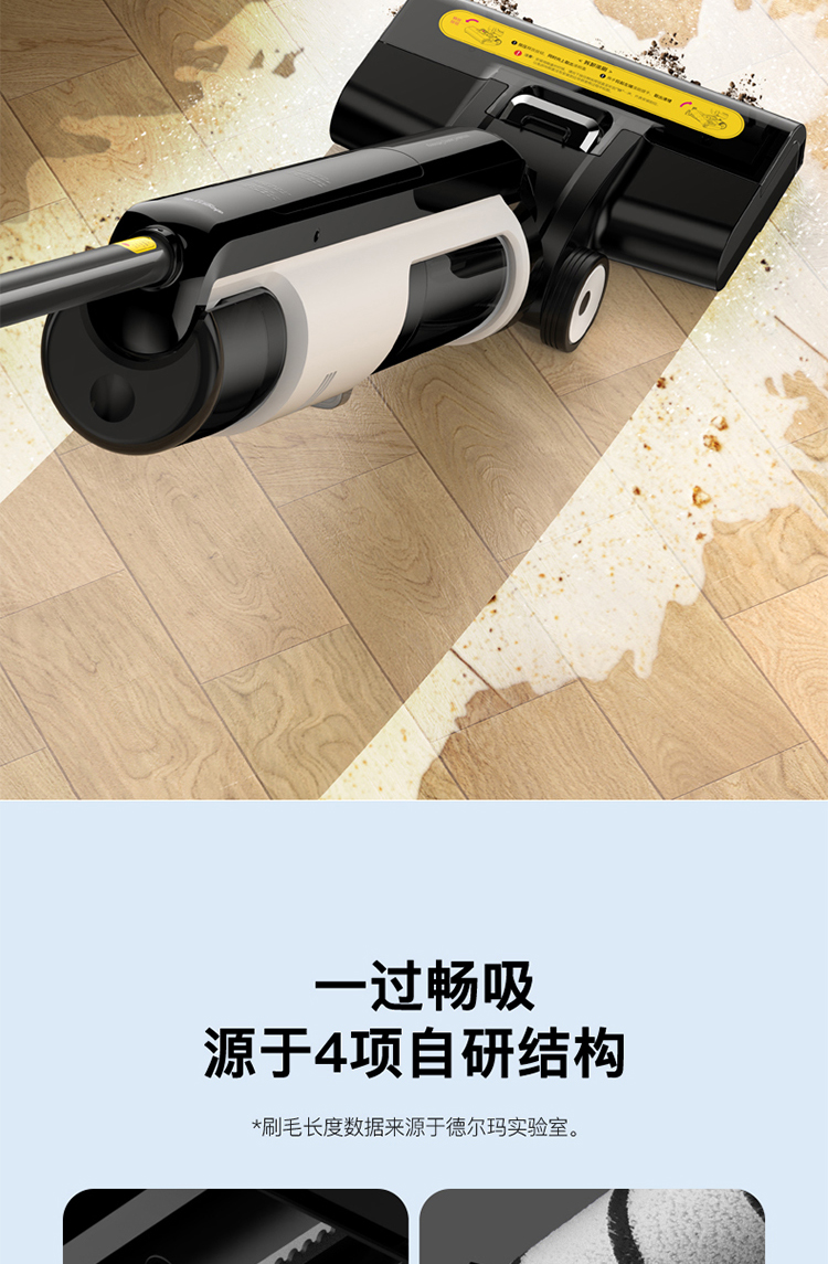 小米生态链企业德尔玛推出的新款洗地机,采用高速主电机+滚刷副电机双动能系统,独立地刷每分钟擦洗达2500次,配合14.5mm长软毛刷,轻松去除顽固污渍,提升吸拖洗的效率,常见干湿垃圾一遍清洁完毕,适合地毯、地砖、地板等不同地面使用
