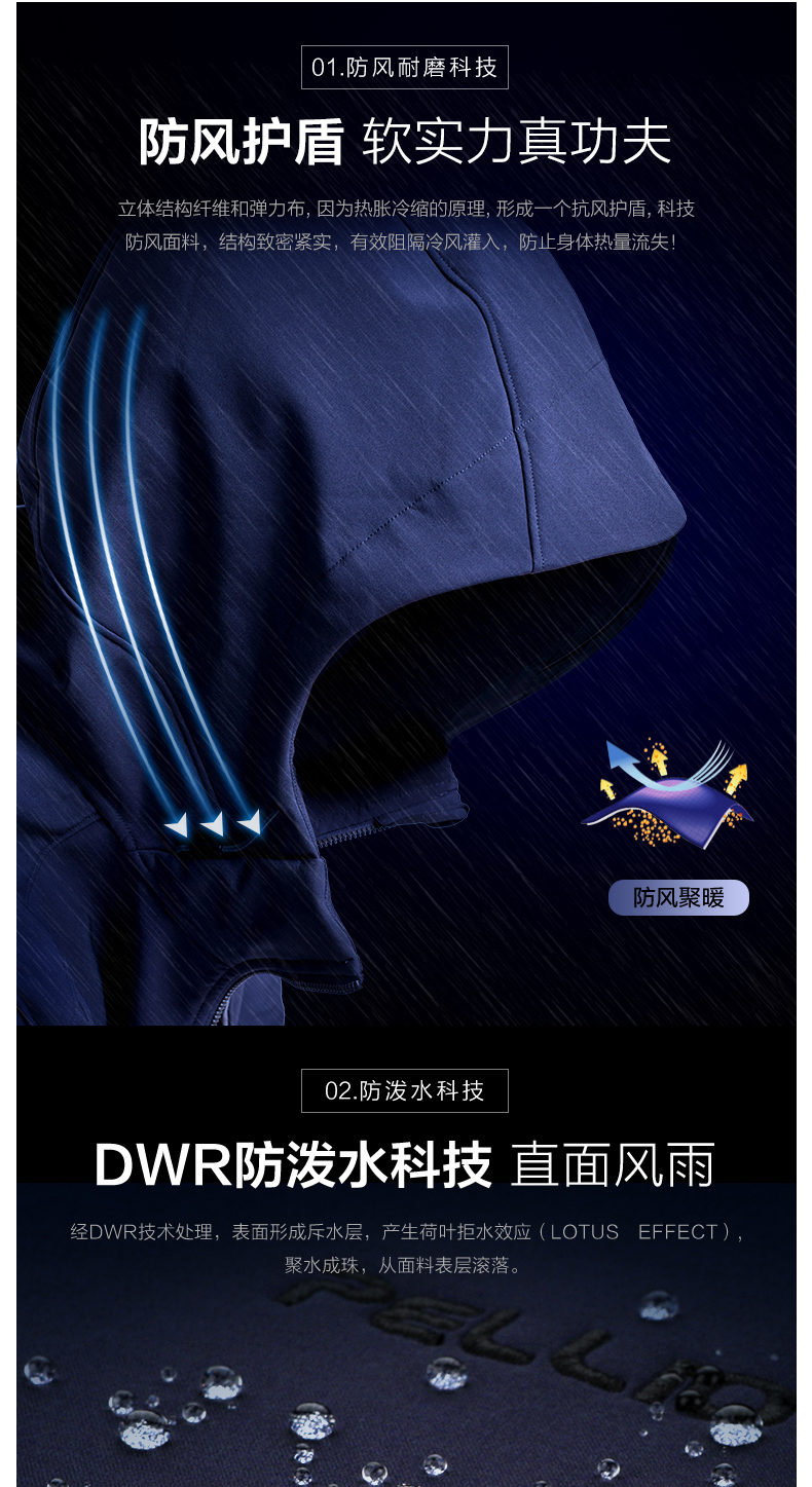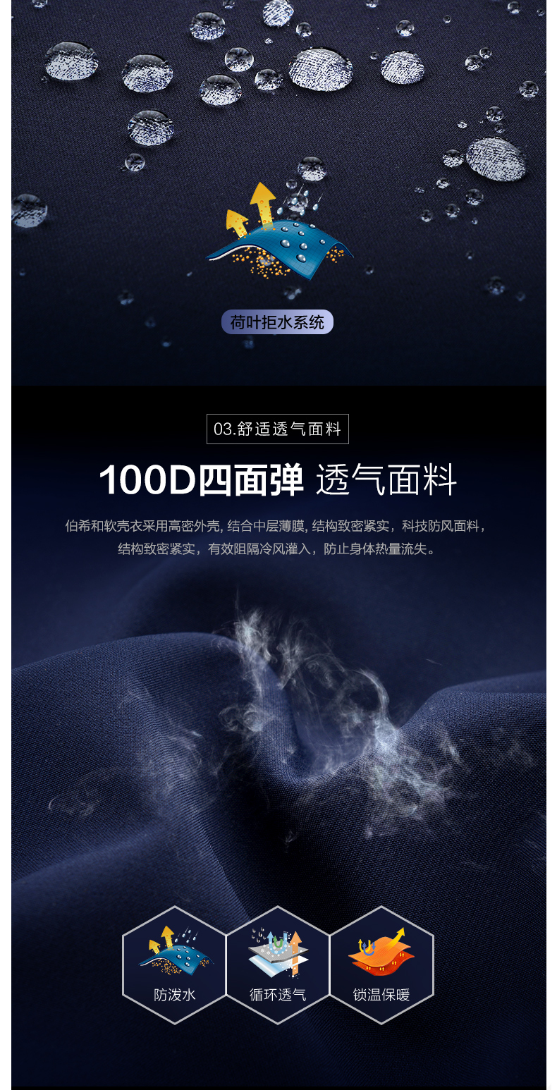 伯希和软壳冲锋衣,一体轻量化设计,采用100D四面弹透气面料结合中层薄膜,结构致密紧实,防风保暖透气,久穿不闷热;针对软壳防水性差的特点,在面料表面DWR技术处理,表面形成斥水层,产生荷叶拒水效果,可以让水凝结成水滴后滚落,表面抗污耐脏,打理方便。内里附着100D优质的摇粒绒,轻量蓬松、达到锁温保暖效果。
