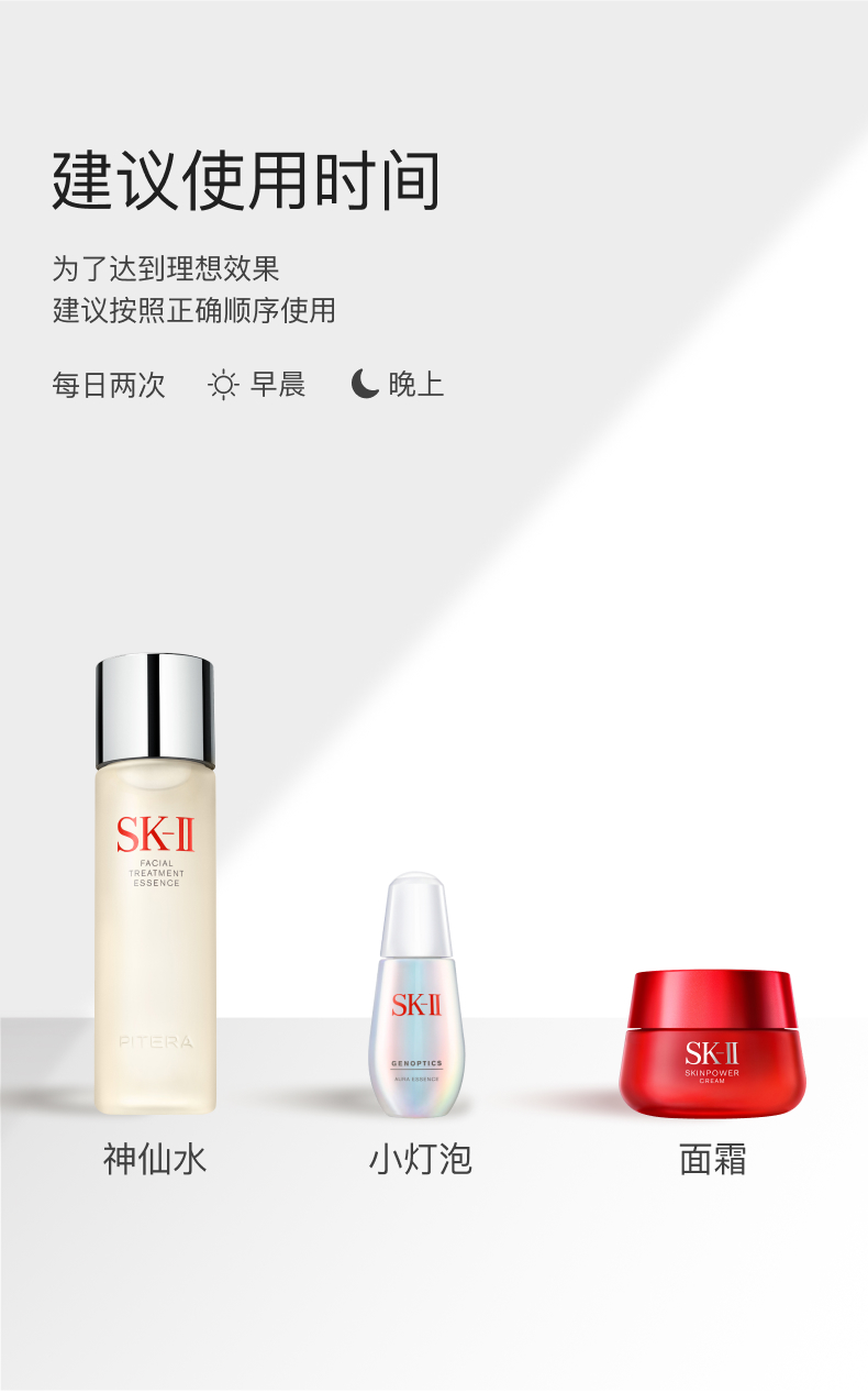 使用方法:先使用SK-II神仙水调理肌质然后沾取适量精华,均匀涂抹全脸,斑点和黯沉部分局部加强,然后进行正常护肤即可。