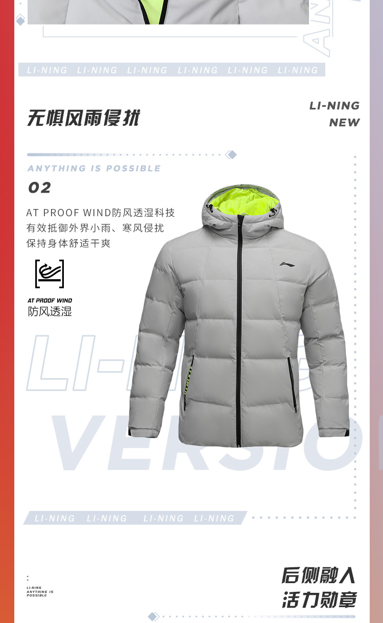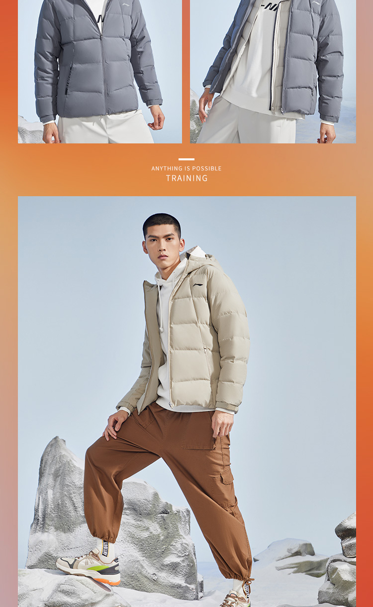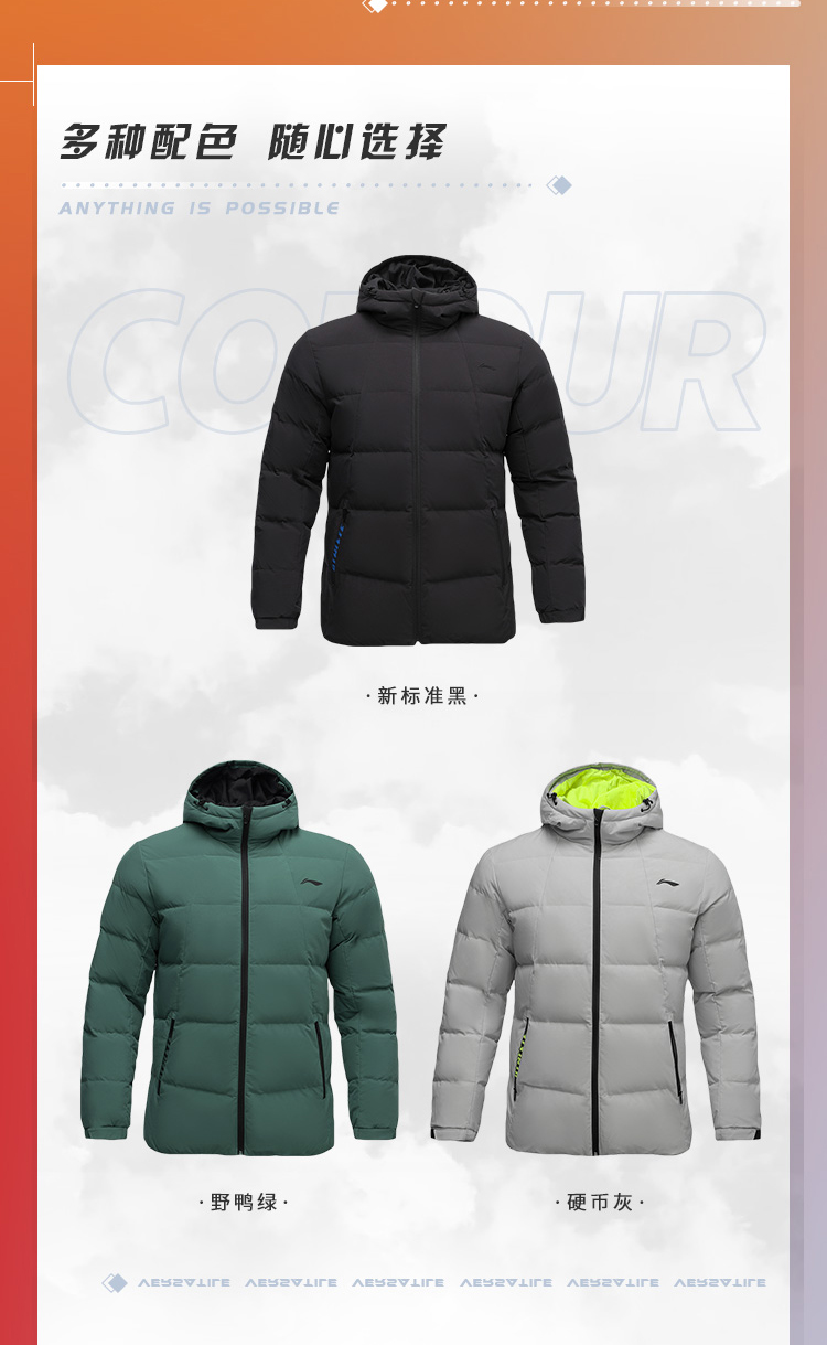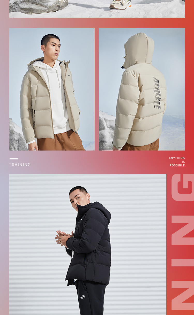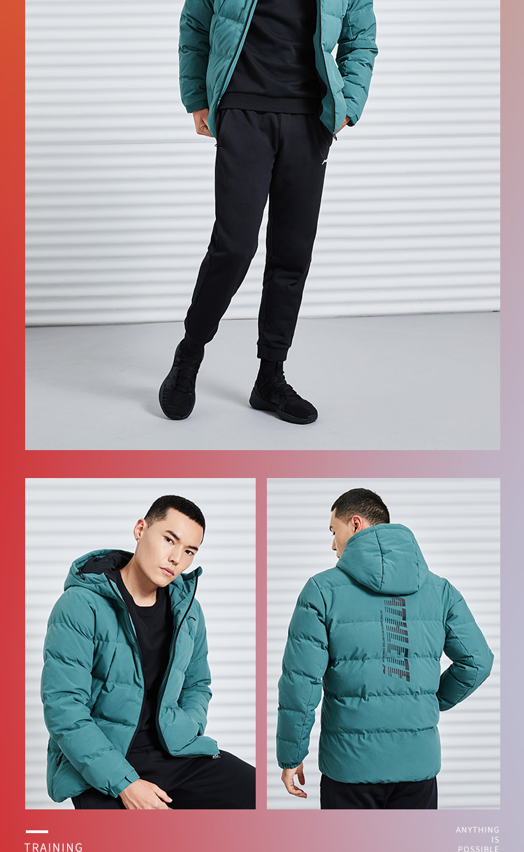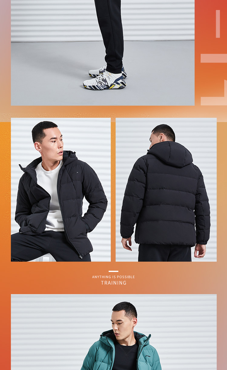 李宁训练系列短款羽绒服,多款配色,简约设计,外层聚酯纤维材质,经过防水透湿科技处理,表层增加了一层TPU材质,能够有效抵御外界小雨、寒风侵扰,保持身体干爽,内里印花采用石墨烯材料能够吸收并反射远红外热能,保持身体温暖。