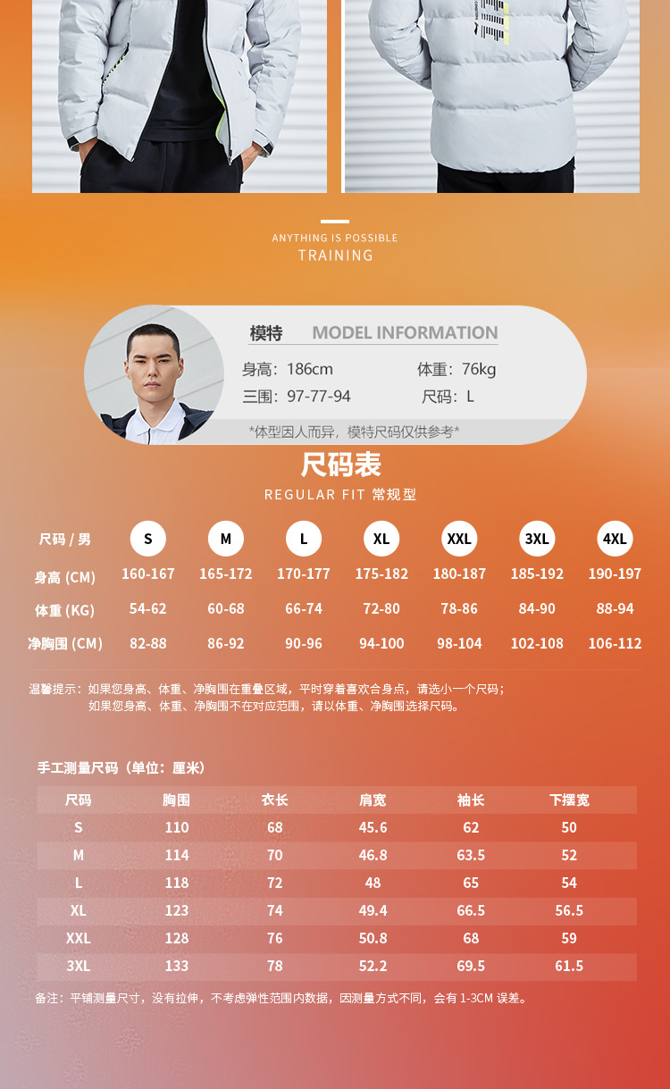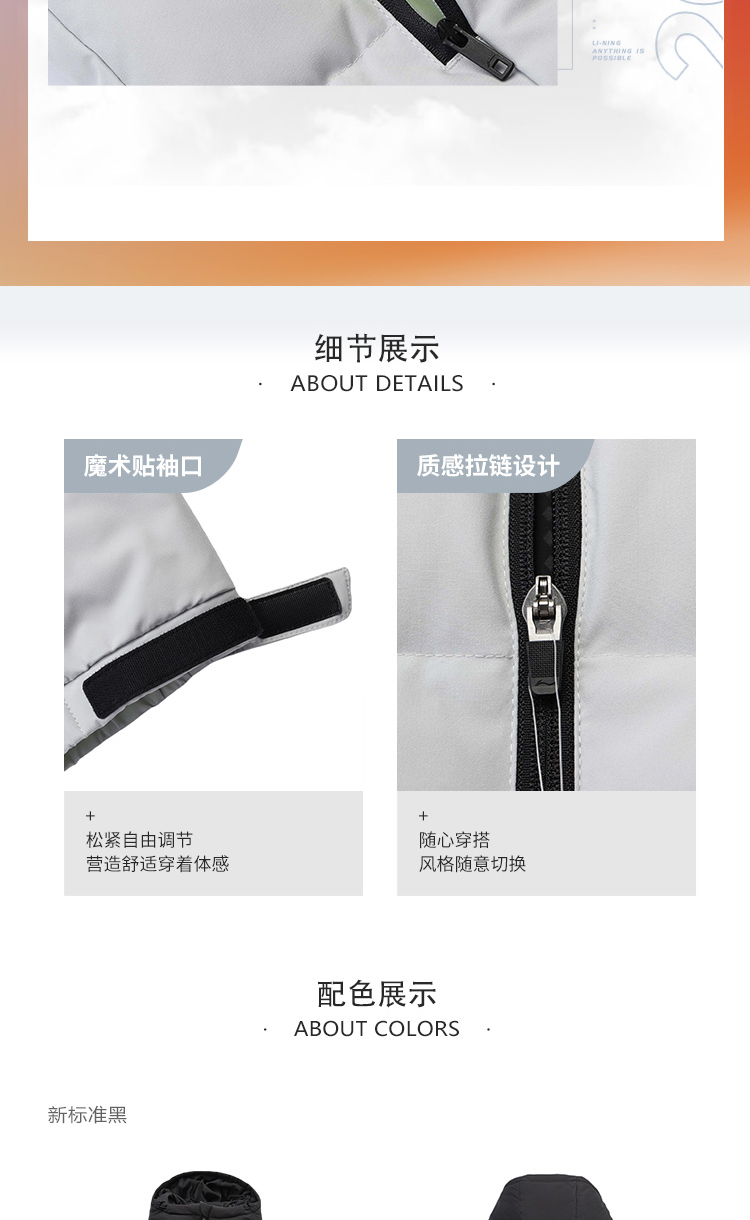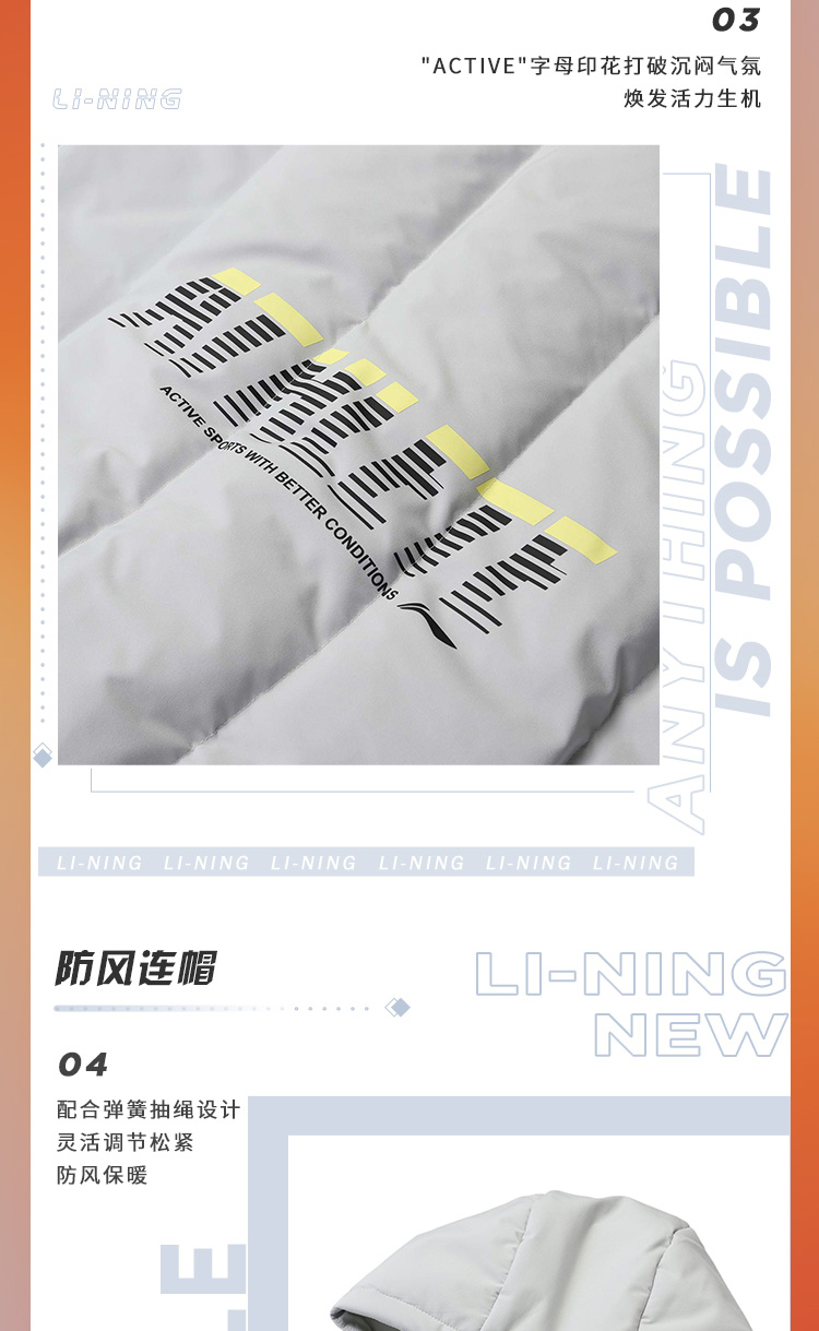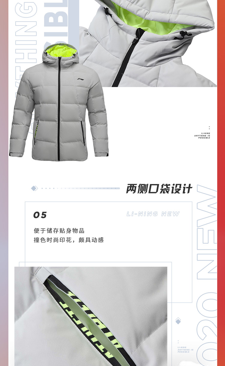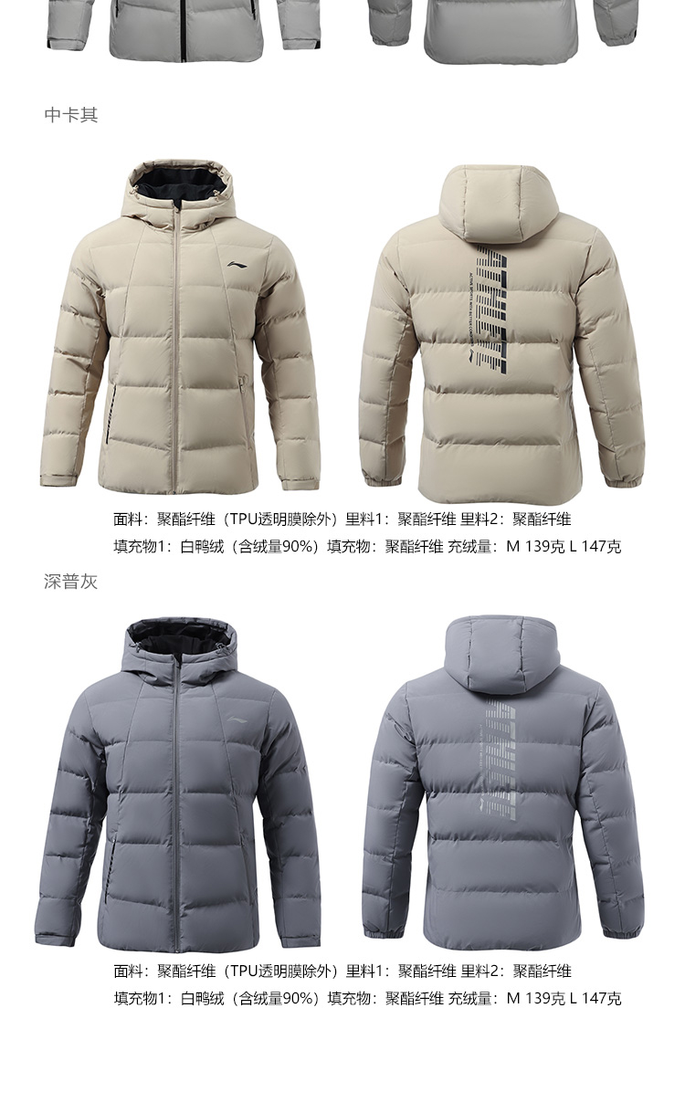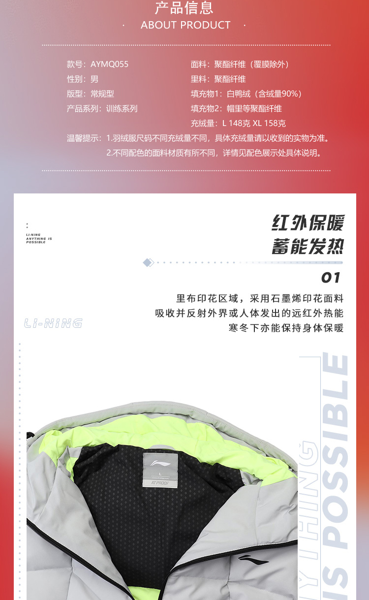 李宁训练系列短款羽绒服,多款配色,简约设计,外层聚酯纤维材质,经过防水透湿科技处理,表层增加了一层TPU材质,能够有效抵御外界小雨、寒风侵扰,保持身体干爽,内里印花采用石墨烯材料能够吸收并反射远红外热能,保持身体温暖。