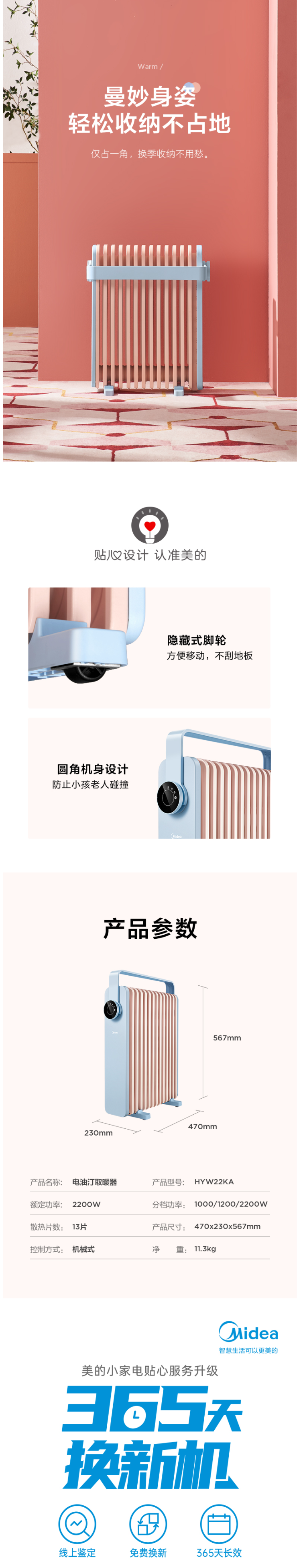 这款美的电热油汀取暖器,166mm加宽油汀片,13片油汀同时升温,创新鱼骨油路速热设计,配合烟囱散热风道,散热面积更大,提高了热效率,制热速度更快,使用寿命更长。