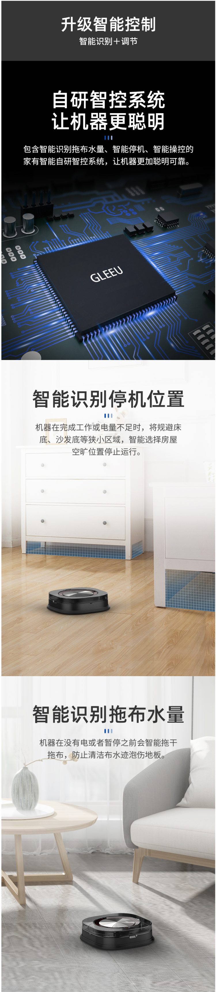 包含智能识别拖布水量、智能停机、智能操控的家有智能自研智控系统,让机器在运行过程中更加智能可靠。