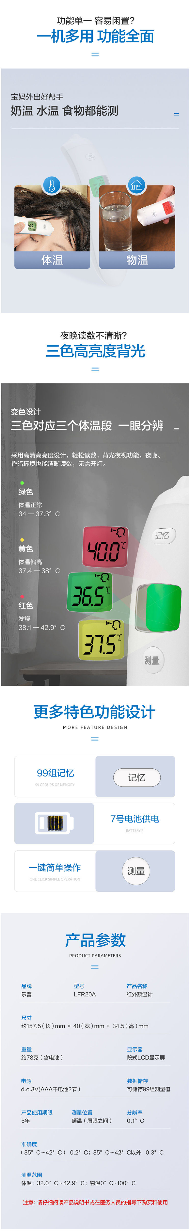 这款乐普医用额温枪,是一款电子红外线温度计,使用进口德国海曼传感器,高端纯铜聚光杯,温度收集更稳定。除了可以测量体温、也可测量耐温、水温和食物。