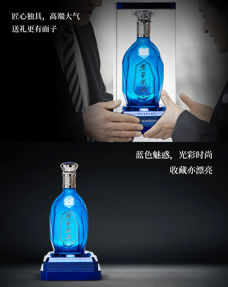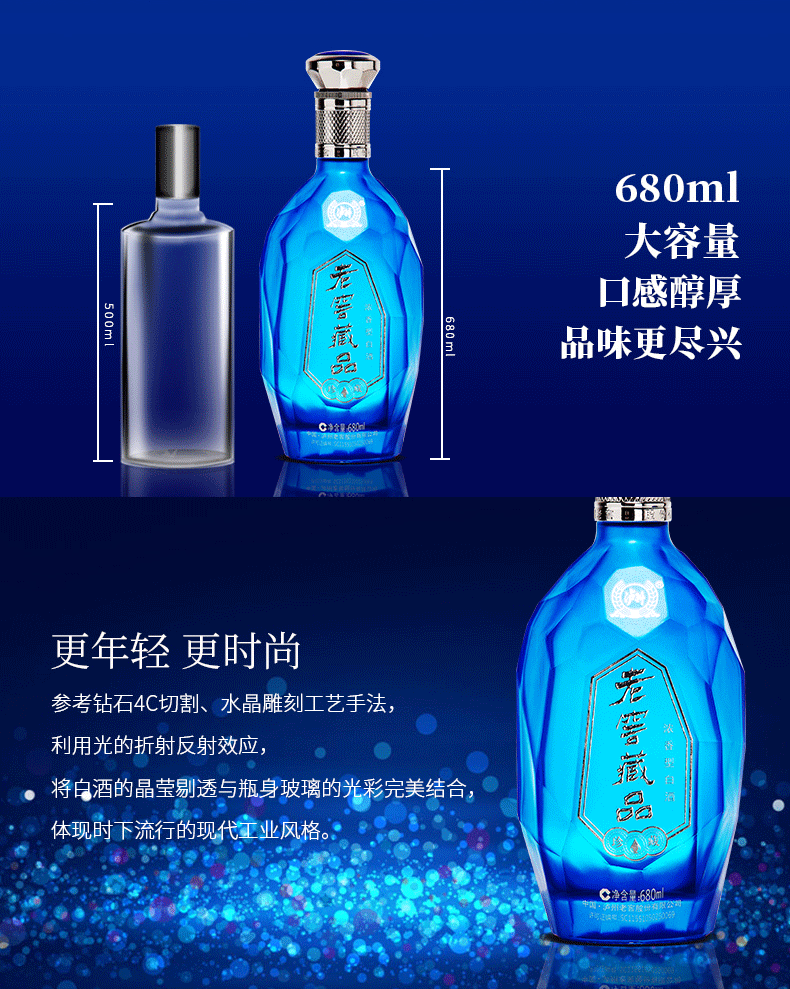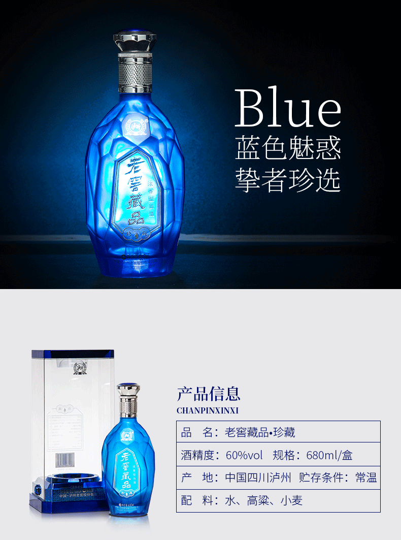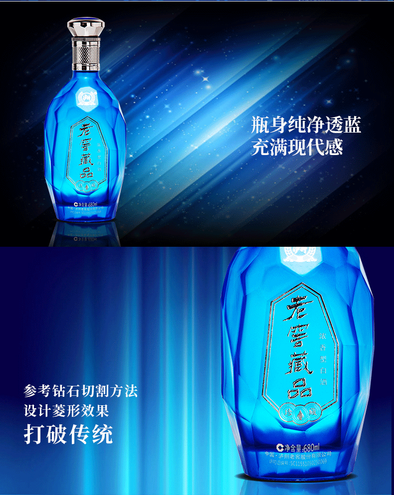 泸州老窖官方直营,老窖藏品·珍藏60度 高度浓香型白酒,高度不刺激,口感醇厚柔和,蓝色魅惑的瓶身,采用钻石4C切割、水晶雕刻工艺手法,利用光的折射反射效应,将白酒的晶莹剔透与瓶身玻璃的光彩完美结合,体现时下流行的现代工业风格,加上银色质感瓶盖,匠心独具,高端大气,送礼更有面子。规格:680ml*6瓶