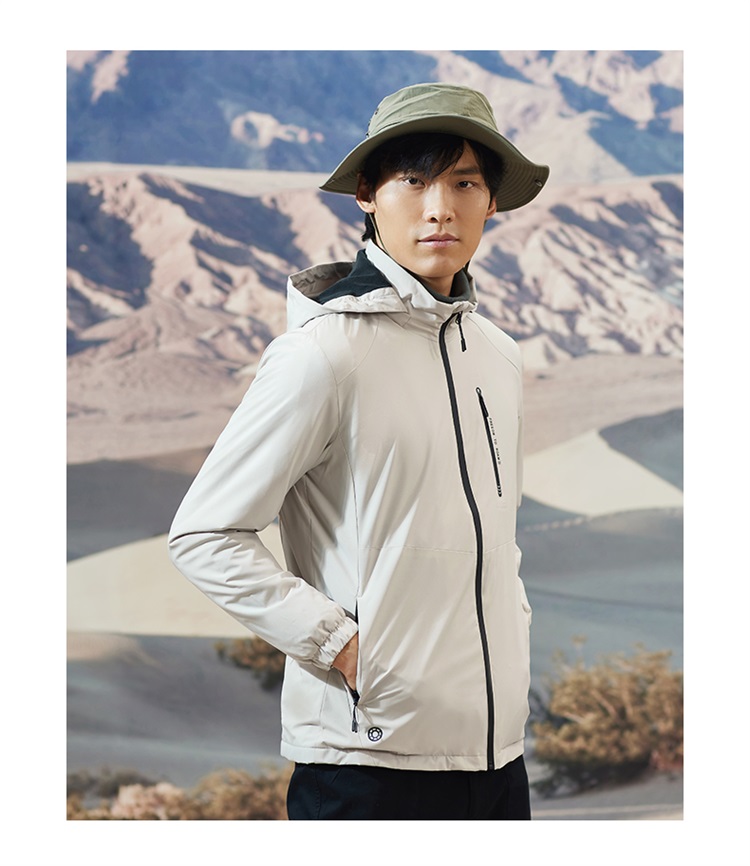 这种防风保暖夹克,中等厚度,本质就是将风衣和抓绒衣做成一体,重量轻便,轻暖比高,适合天气还没那么冷,不需要穿羽绒服的时候穿着。