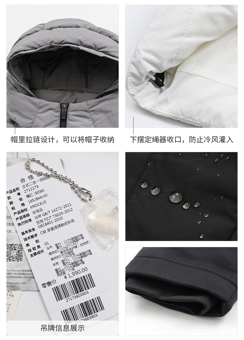 首先是马甲,马甲选用记忆面料,加上防泼水处理,不易起皱、可防小雨,内里填充的是90%鹅绒,保暖效果不错。马甲是标准版型,高领,一体连帽,不过可以收纳到领子里,变为大领口。下摆有松紧调节扣,防止冷风倒灌。