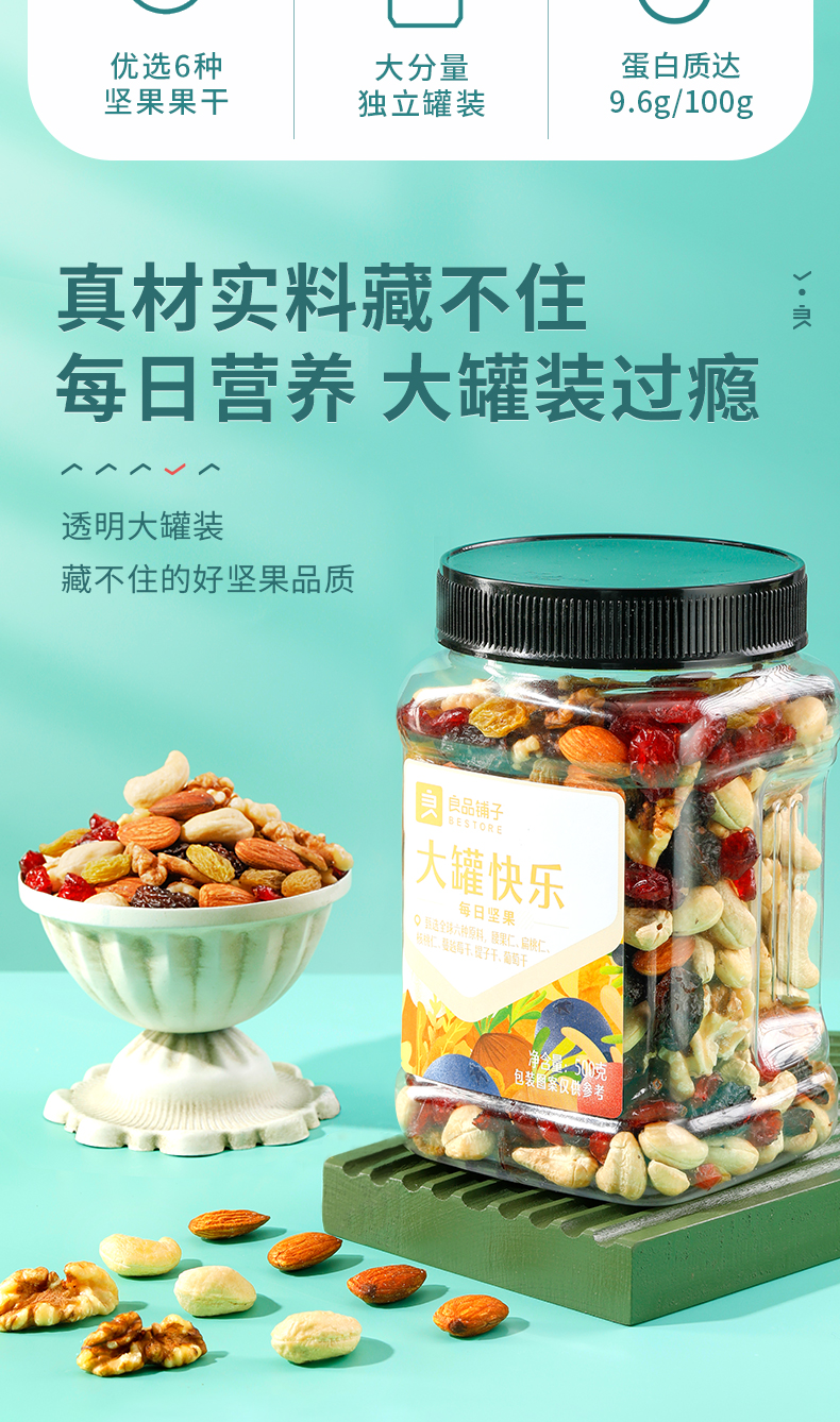 这款良品铺子 每日坚果 ,规格:500g,精选4国原料,含提子、美国扁桃仁、美国蔓越莓干、新疆葡萄、新疆核桃仁、越南腰果仁,小火慢烘,无添加色素、香精、食品添加剂等,果仁干脆,果脯新鲜。领券链接点此