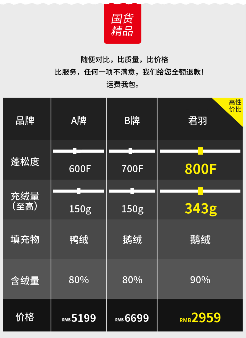 「鹅绒」800蓬鹅绒成本约是普通鸭绒的10倍,没有鸭毛的腥味,保暖效果更好:「300克 800蓬鹅绒」≈「389克 389蓬普通鹅绒」≈「555克普通鸭绒」。