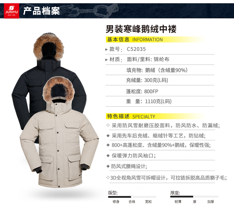 这款君羽寒峰男中长款羽绒服,属于极寒系列,可抗-30℃~-40℃,是2018年的冬季款,内里填充了800蓬90%鹅绒,L码充绒300克,属于超重装羽绒服。外层是高密度耐磨锦纶布,伴有压胶加持,可防风防雨雪。工装风款式,长度过臀及大腿。