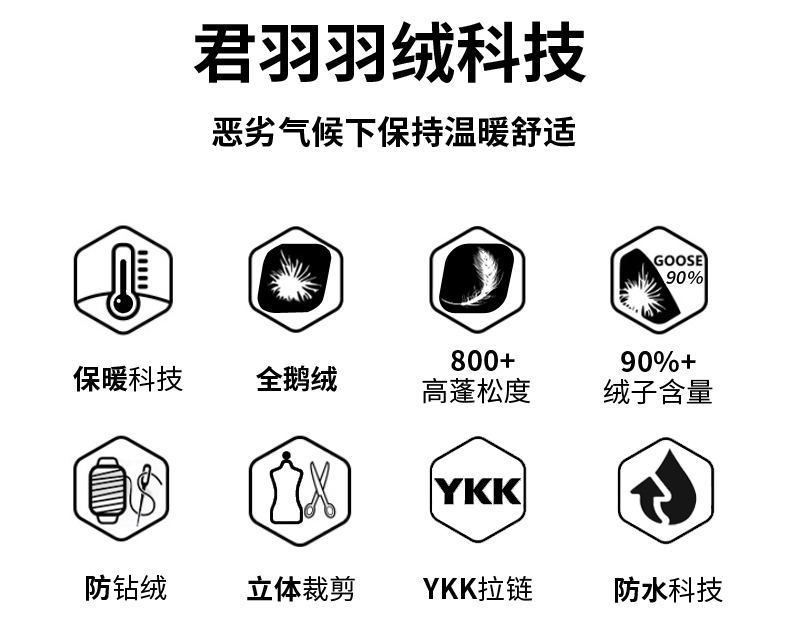 充绒量为:S码263克、M码279克、L码300克、XL码311克、XXL码327克、XXXL码343克