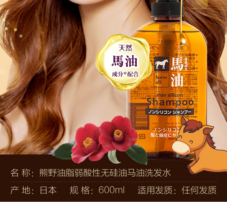 这款熊野油脂 马油无硅油去屑洗发水是日本原装进口,采取天然植物精华—无患子提取物、忍冬提取物、马脂、水解小麦蛋白,0硅油刺激,头皮无负担,同时马油的高渗透性,能让营养物质能注入发芯,修复滋养头发。