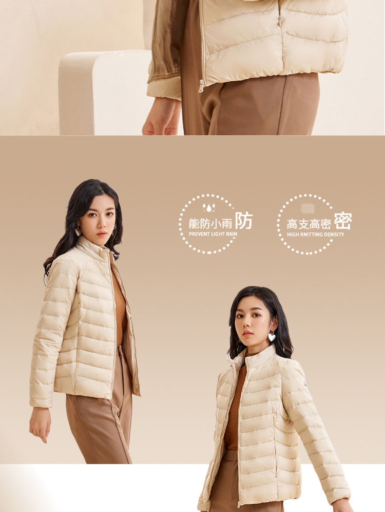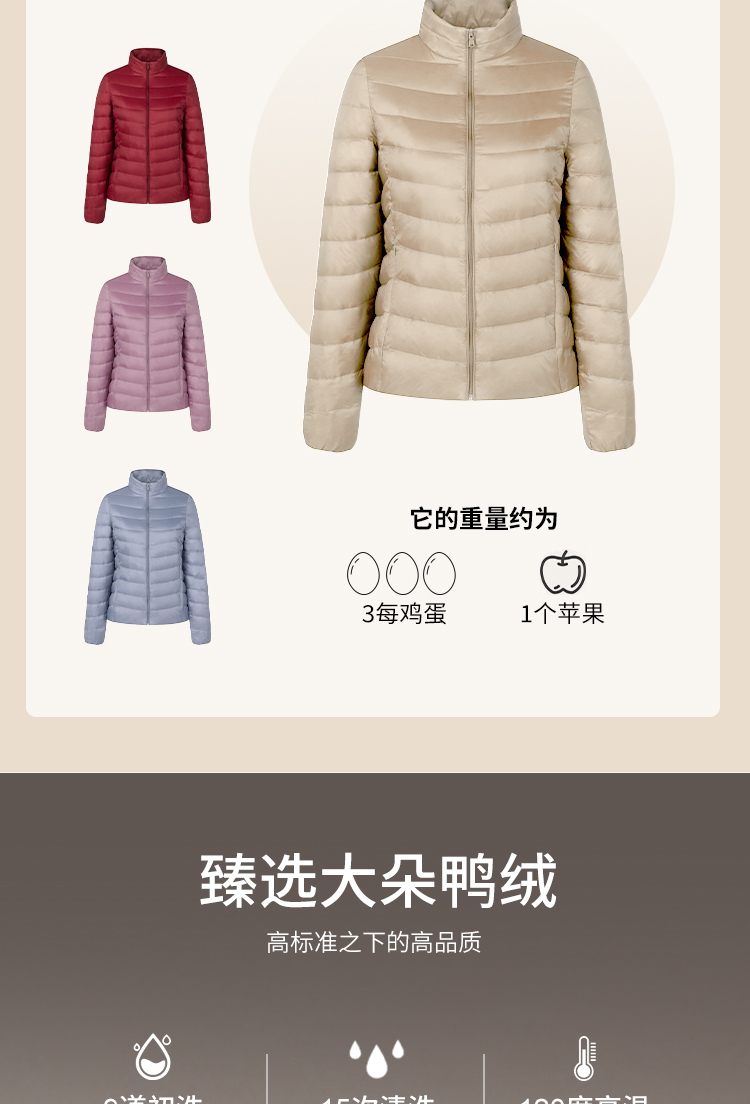 这款 冰洁 女士轻薄羽绒服,高品质90%白鸭绒填充,上身轻盈保暖,进口防绒针、精密缝制、防绒纱线三大锁绒科技,防钻绒,立领设计,更防风。领券链接点此