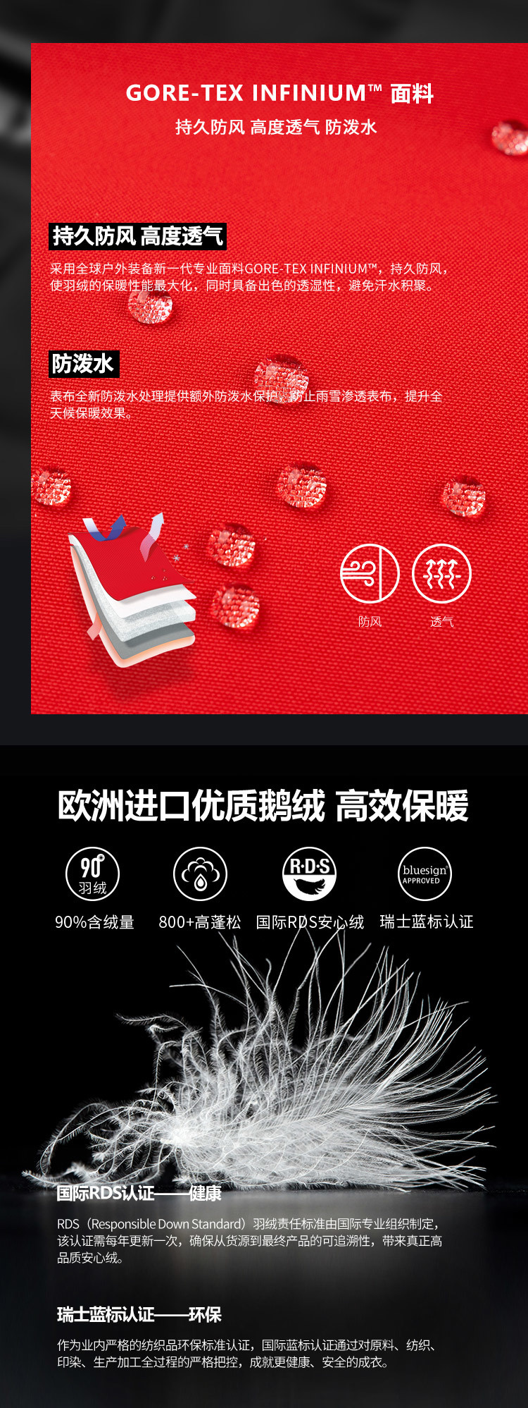 在功能面料领域,美国Gore公司的Gore-Tex和Windstopper是行业标杆,Gore-Tex防水,Windstoper防风。顶级旗舰款羽绒服,多使用Gore-Tex或Windstopper,优点都是保暖足够,防水防风功能强悍。