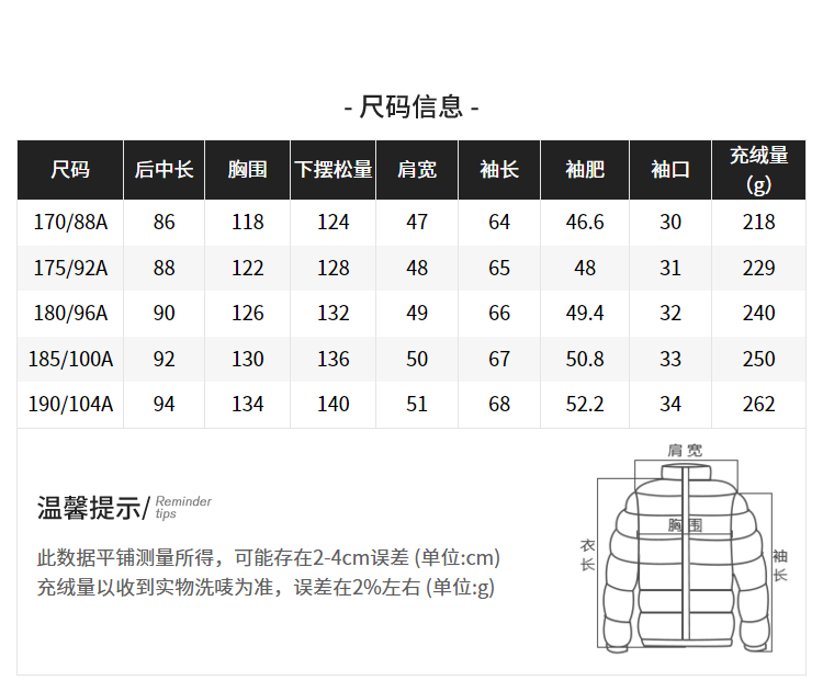 欧洲进口优质鹅绒,90%含绒量、800+高蓬松度;国际RDS+瑞士蓝标认证双重认证,生产过程严格把控,确保货源到最终产品的可溯源性,真正的高品质放心绒。充绒量高达218-265g,蓬松轻盈,极寒保暖,