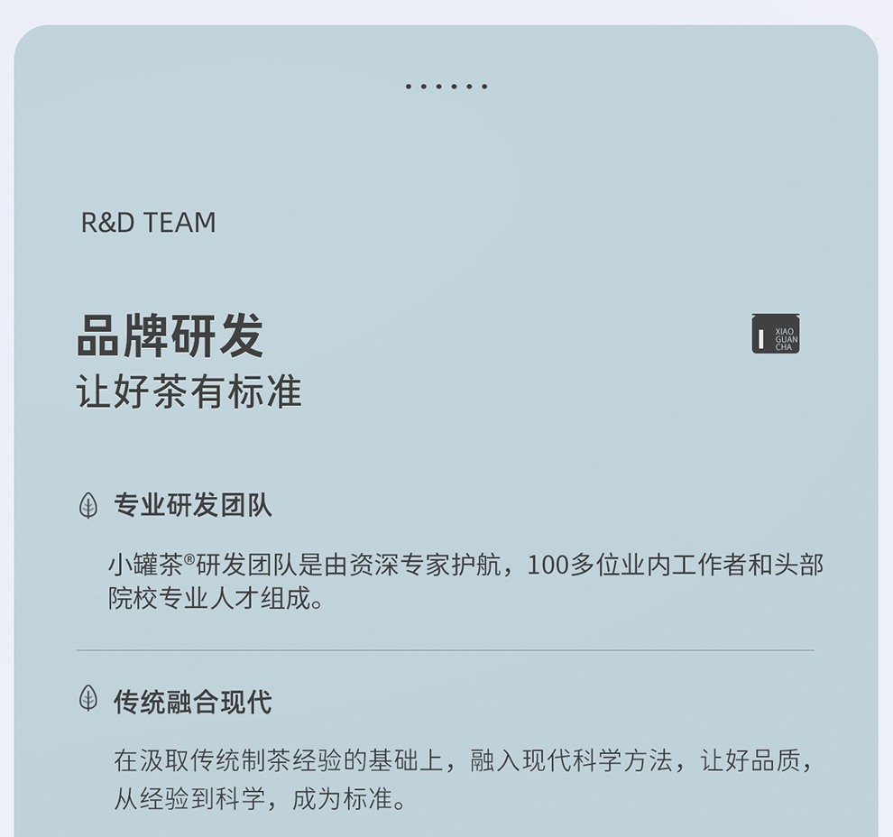 小罐茶的茶叶均来自于产地严选,由国家级非物质文化遗产的技艺传承人监制,铝罐覆膜,充氮保鲜,使茶叶随意保存就能不吸味、不受潮、不氧化、不破碎,研发团队用现代科学的方法,让好品质从经验到科学,标准化生产。