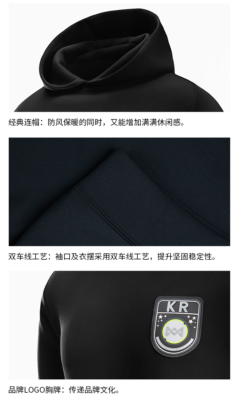 衣面底色是显瘦的纯黑色色调,搭配经典连帽套头卫衣款式,可以应对生活中多种场合搭配,耐穿耐看,休闲感十足。简约百搭。