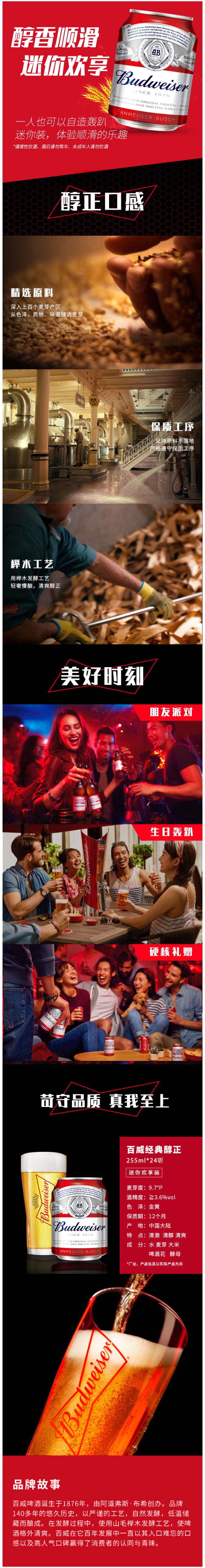 百威醇正经典,浓郁香醇的口感,泡沫细腻丰富,喝一口就难忘,冷藏饮用更佳。百威啤酒在世界范围内都有着较大的销量,在国内也受消费者欢迎。百威经典啤酒,口感清澈、清醇、清爽。酒精度3.6%vol,原麦汁浓度9.7°P。