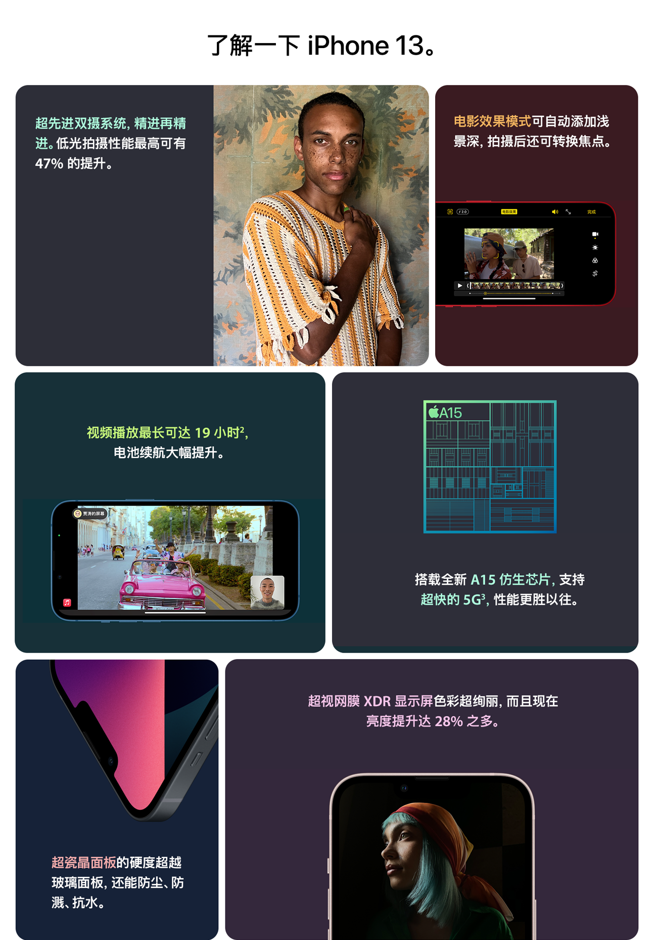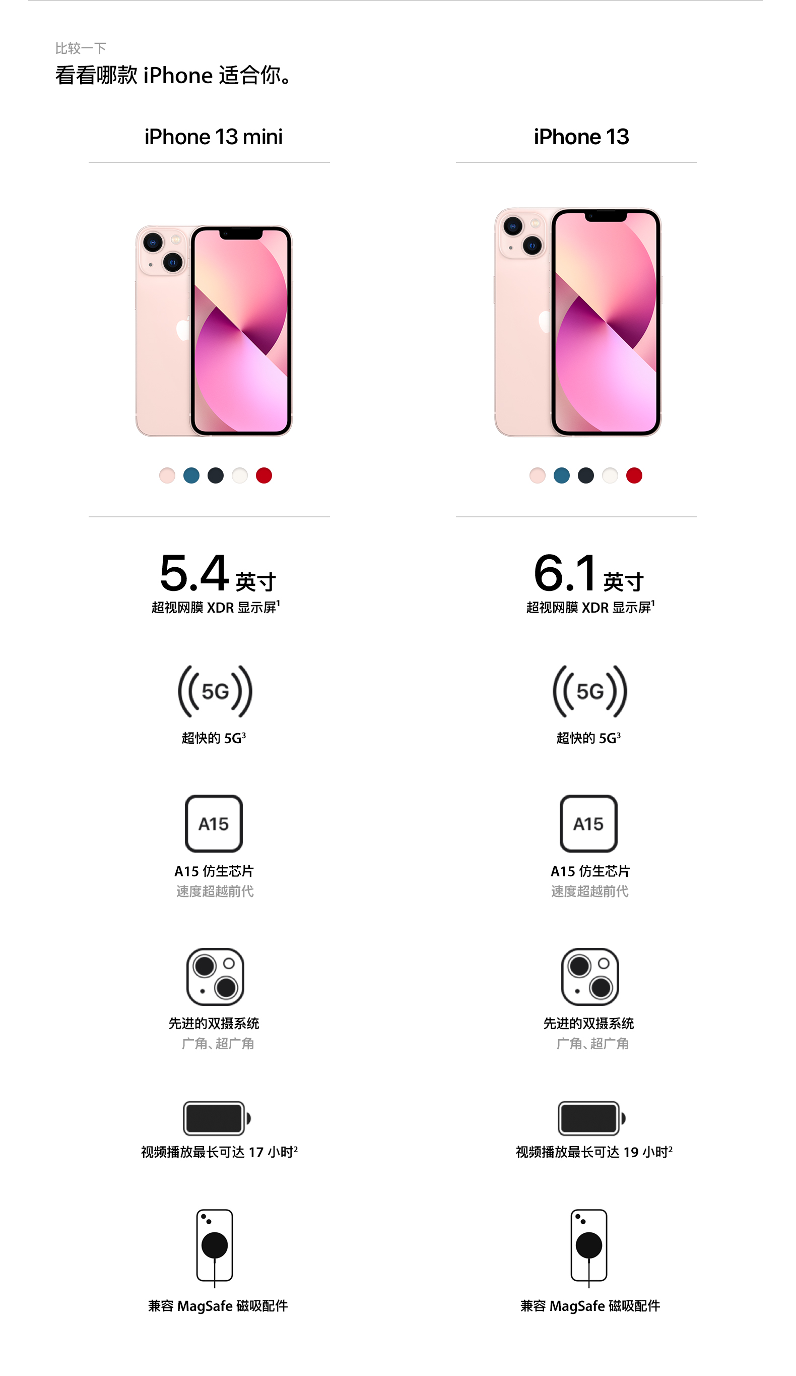 iPhone 13 边缘采用平坦设计、配备独家超瓷晶面板,支持 IP68 抗水性能,拥有五种颜色可选择,粉色、蓝色、午夜色、星光色和红色。屏幕方面,iPhone 13/13 mini 采用 6.1/5.4 英寸 OLED 超视网膜 XDR 显示屏,分辨率 2532*1170/2340*1080,亮度提高 28%,最高可达 800 尼特,拥有 DCI-P3 广色域。另外,iPhone 13系列的屏幕“刘海”面积缩小20%,大体只相当于前代的一半,可以减少对屏幕显示区域的遮挡,支持口罩面部解锁功能。