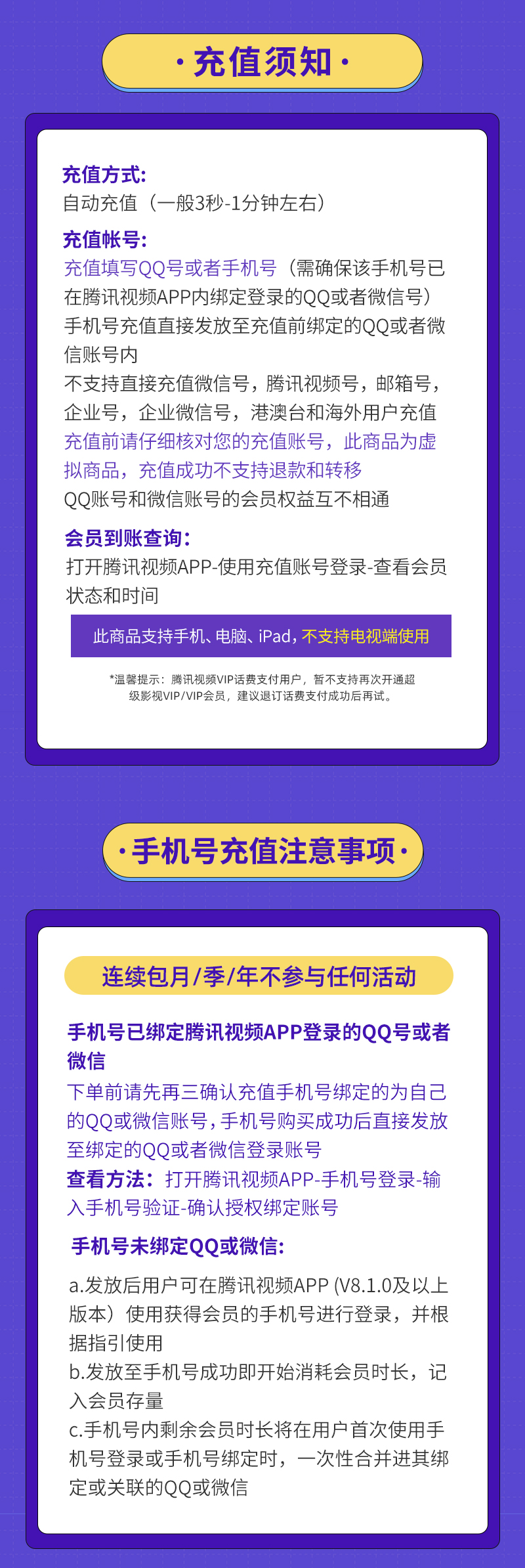 腾讯视频VIP:电脑、iPad、手机(官方标价:20元/月、198元/年)超级影视VIP:电脑、iPad、手机、电视(官方标价:30元/月、330元/年)