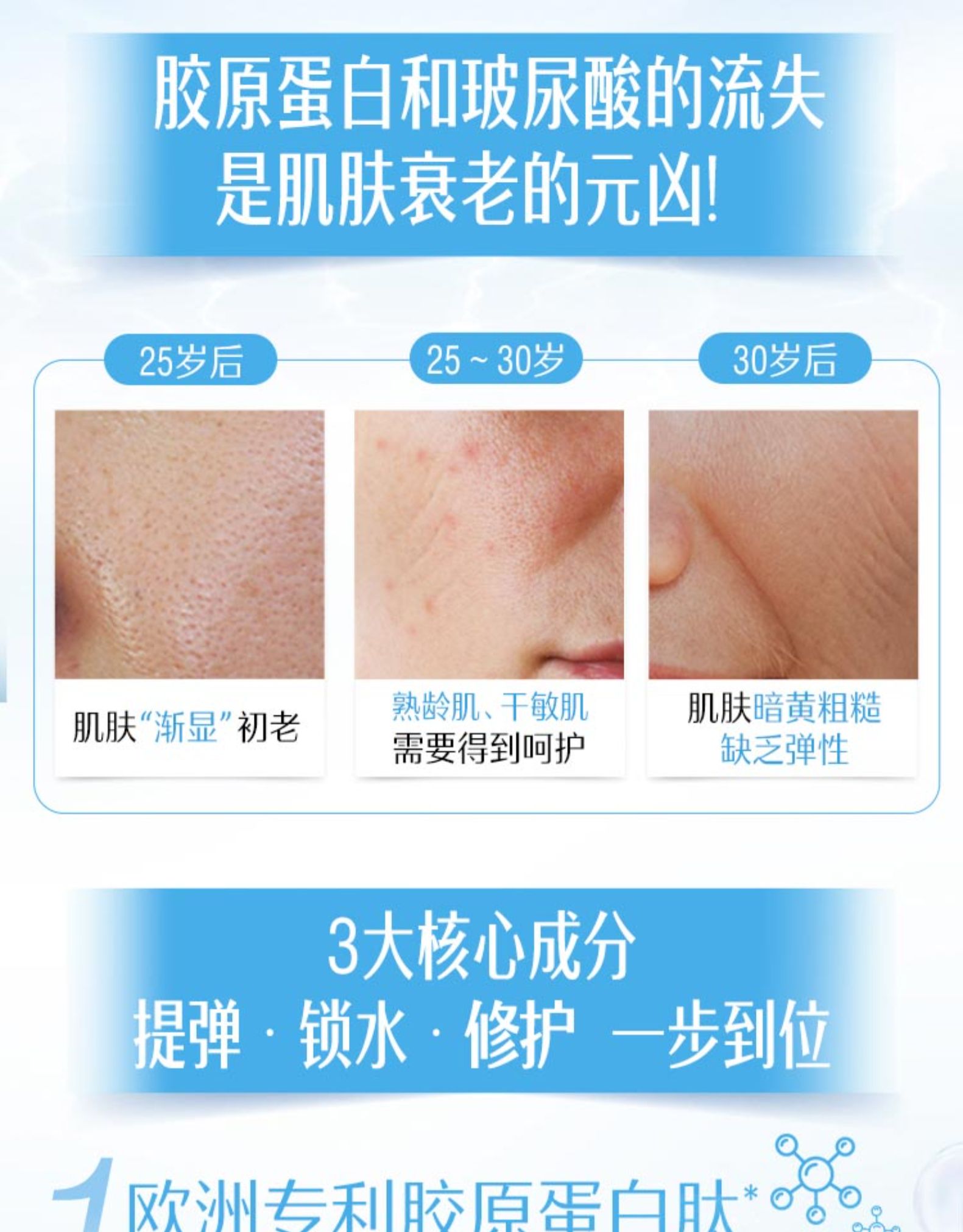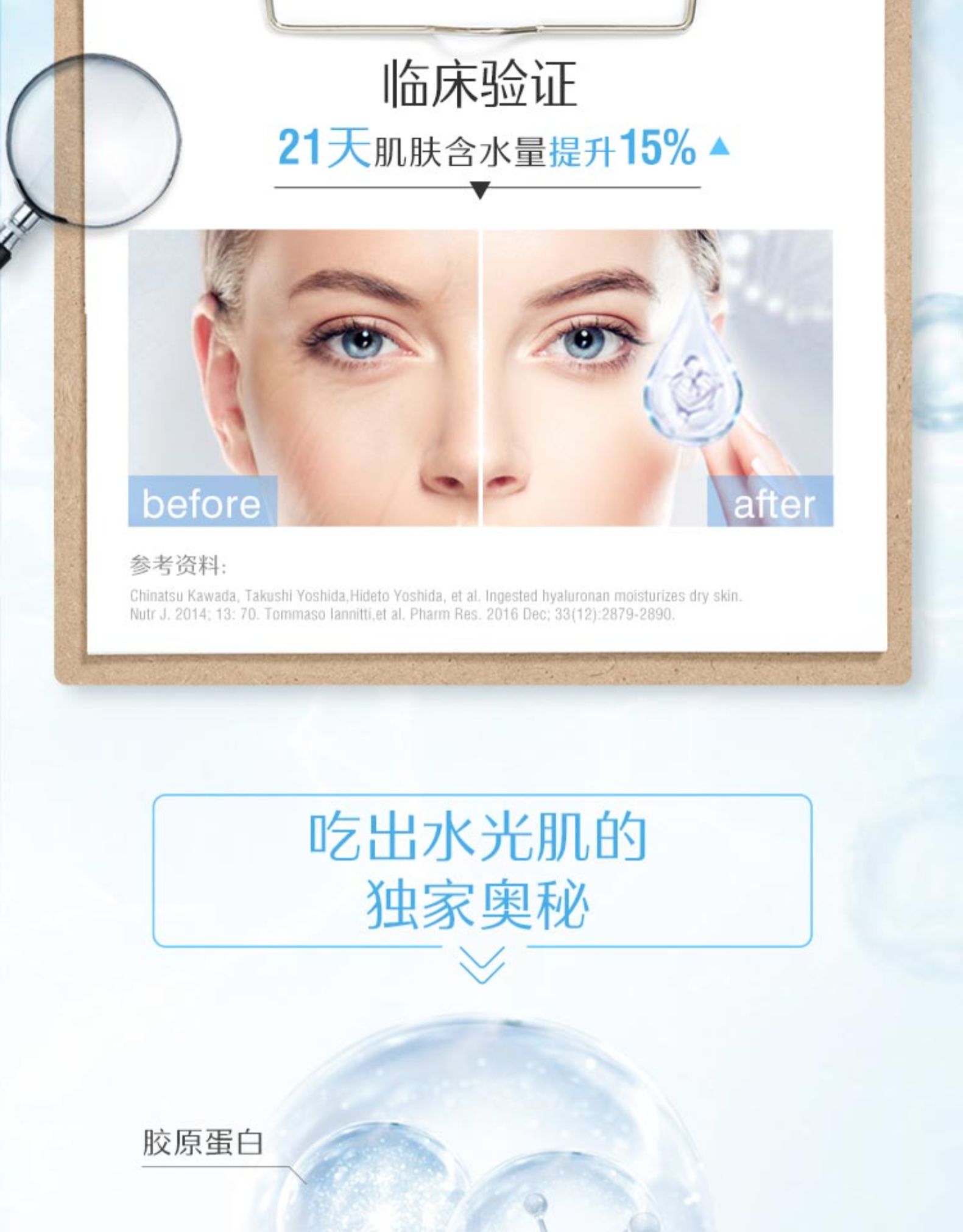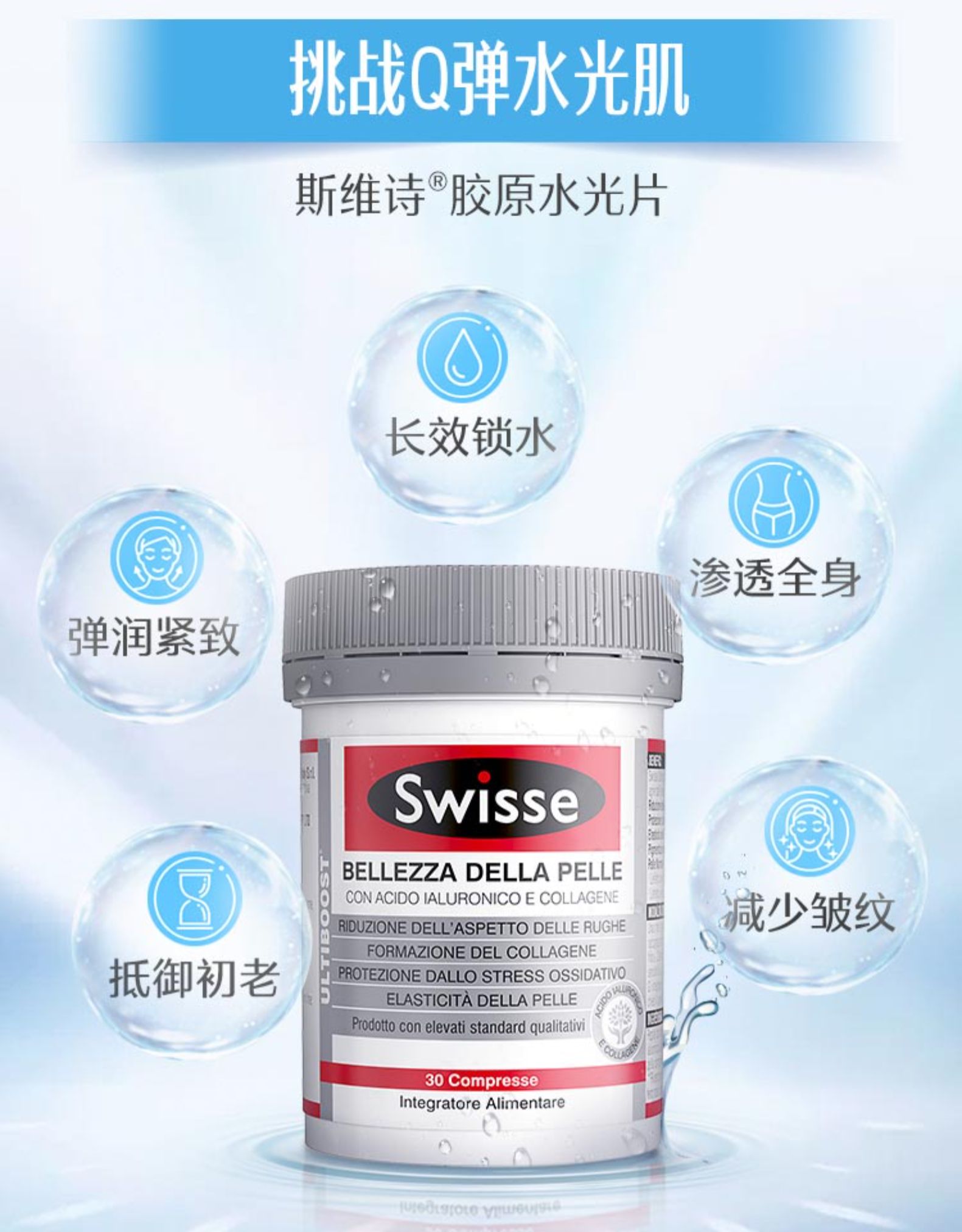 这款Swisse 医美级口服玻尿酸胶原蛋白水光片,澳洲原装进口,规格30片/瓶,每片含40mg玻尿酸、833mg水解胶原蛋白、133μg维生素A、27mg维生素C、2mg维生素E,170μg铜,玻尿酸分子表面含有大量的亲水基因,能像海绵一样吸收自身重量1000倍的水分,长效锁住水分,保持肌肤水嫩饱满,水解胶原蛋白分子量低于2000Da,被胃肠道吸收并补到全身皮肤真皮层,撑起肌肤胶原网,让全身肌肤都能水嫩饱满有弹性,维生素C/E、铜有效抵御氧化,对抗紫外线损伤,并促进内源性胶原蛋白合成,延缓肌肤衰老,维生素A缓解因营养、日照、环境等因素对肌肤影响,促进细胞新陈代谢,帮助修复肌肤细胞,让肌肤充满活力。食用建议:每天3次,每次1粒,随餐服用。