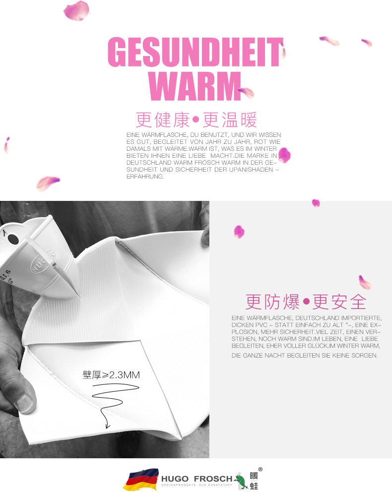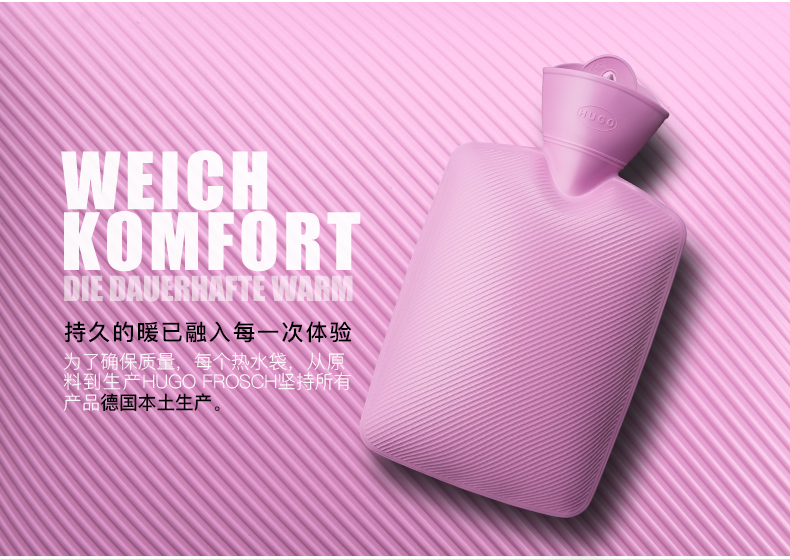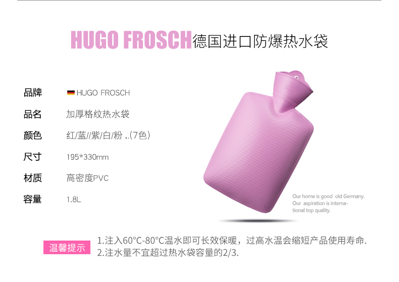 这款1.8L的HUGO FROSCH 热水袋,德国原装进口,一体式外形设计,颈口无接缝确保不漏;内外双层设计,内层是使用经过德国TUV安全认证的一体成型高密度医用级PVC材质,抗压能力可通过汽车碾压测试,老化速度慢,放在被 窝可持续发热7-12小时,晚上放在被 窝早上水袋还是热的。