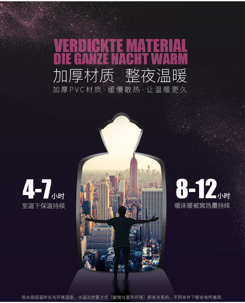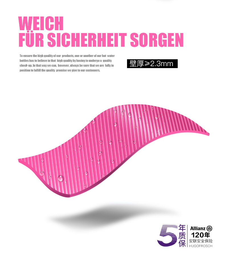 90mm的加大注水口,注水容易,避免高温水花迸溅;精密罗纹防漏旋钮,增压密闭式旋盖,无缝贴合,滴水不漏;热水袋表面还有防烫纹,尺寸为195*330mm。使用寿命长达5年以上。