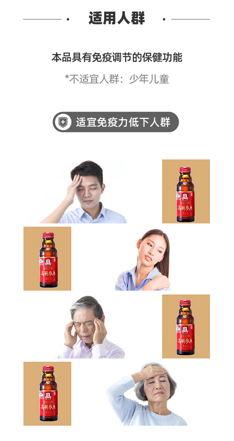 这款正官庄6年根高丽参元液,以6年根高丽参为原材料(高丽参富含32种人参皂甙),在以大枣、肉桂、枸杞子、生姜浓缩液为辅料。特点是易吸收,每支人参皂甙含量达10-20mg。服用方法:1日1次。能够大补元气,提高记忆力,小瓶包装,携带十分方便,可以随时随地饮用来增强活力。