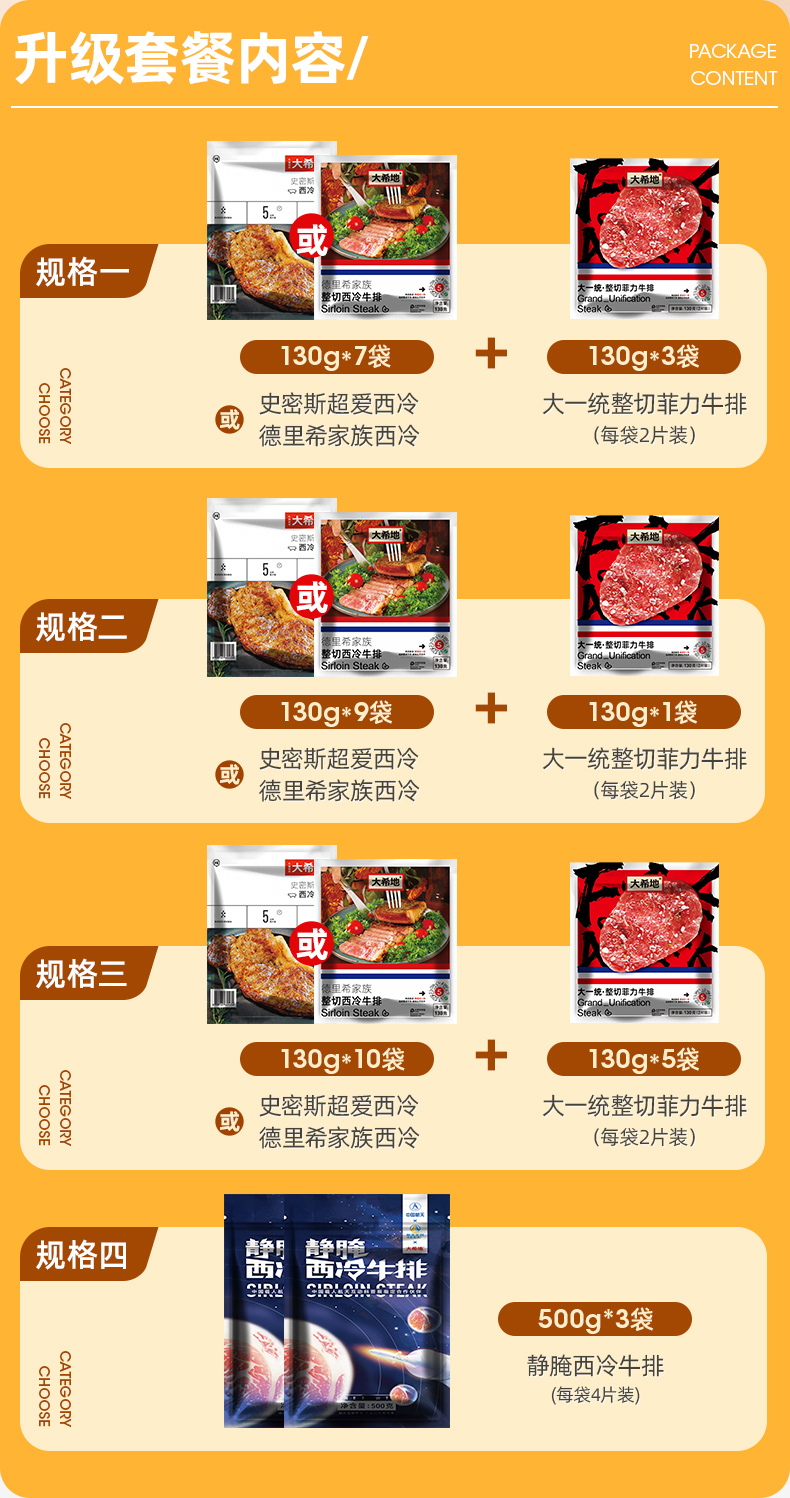 包含:西冷牛排130g*7+菲力130g*3。