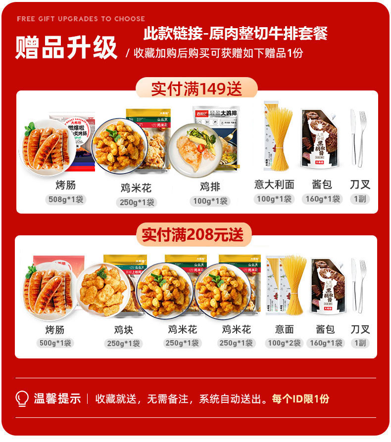 赠:鸡块250g、鸡米花250g、刀叉、酱包、意面100g这5件超值赠品,