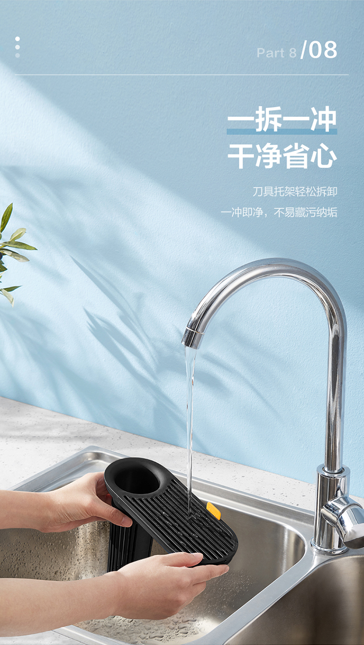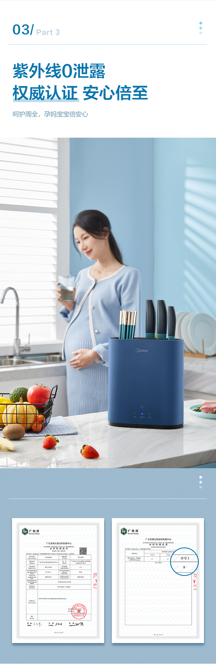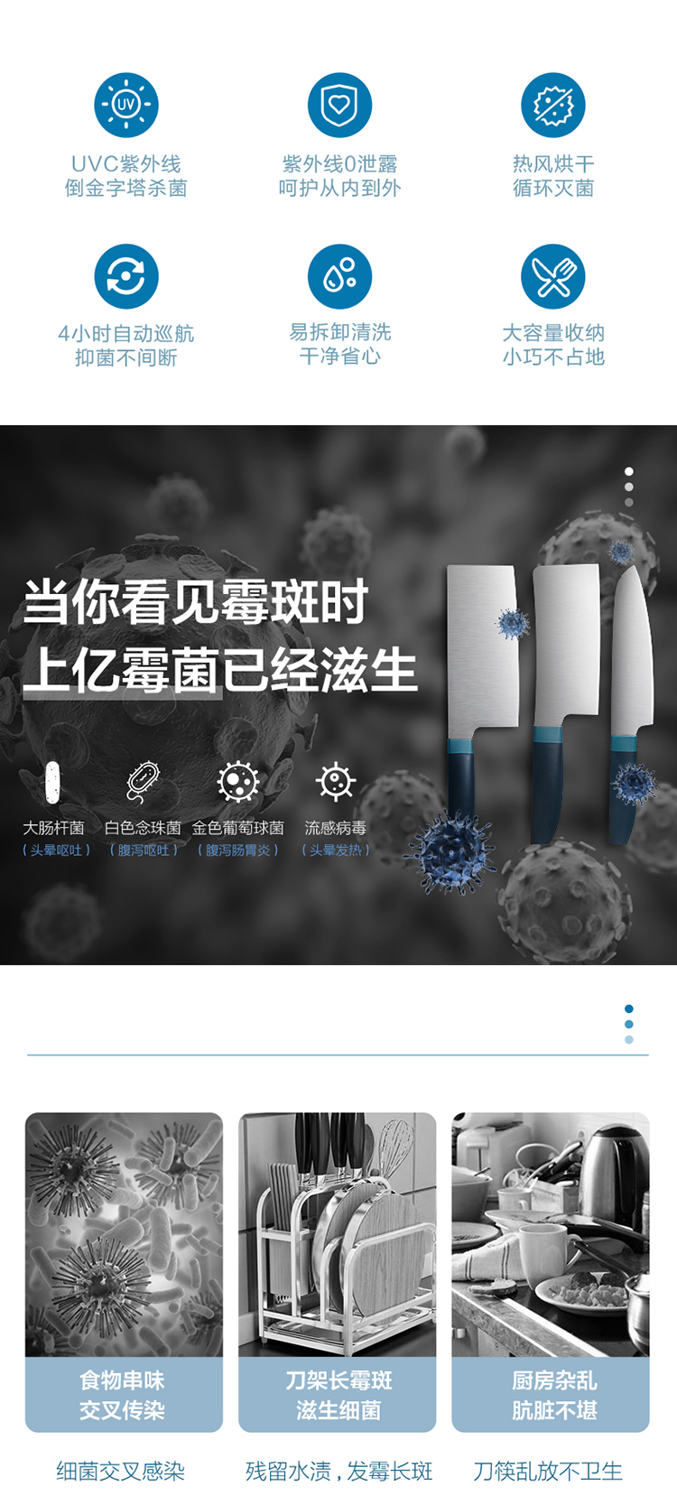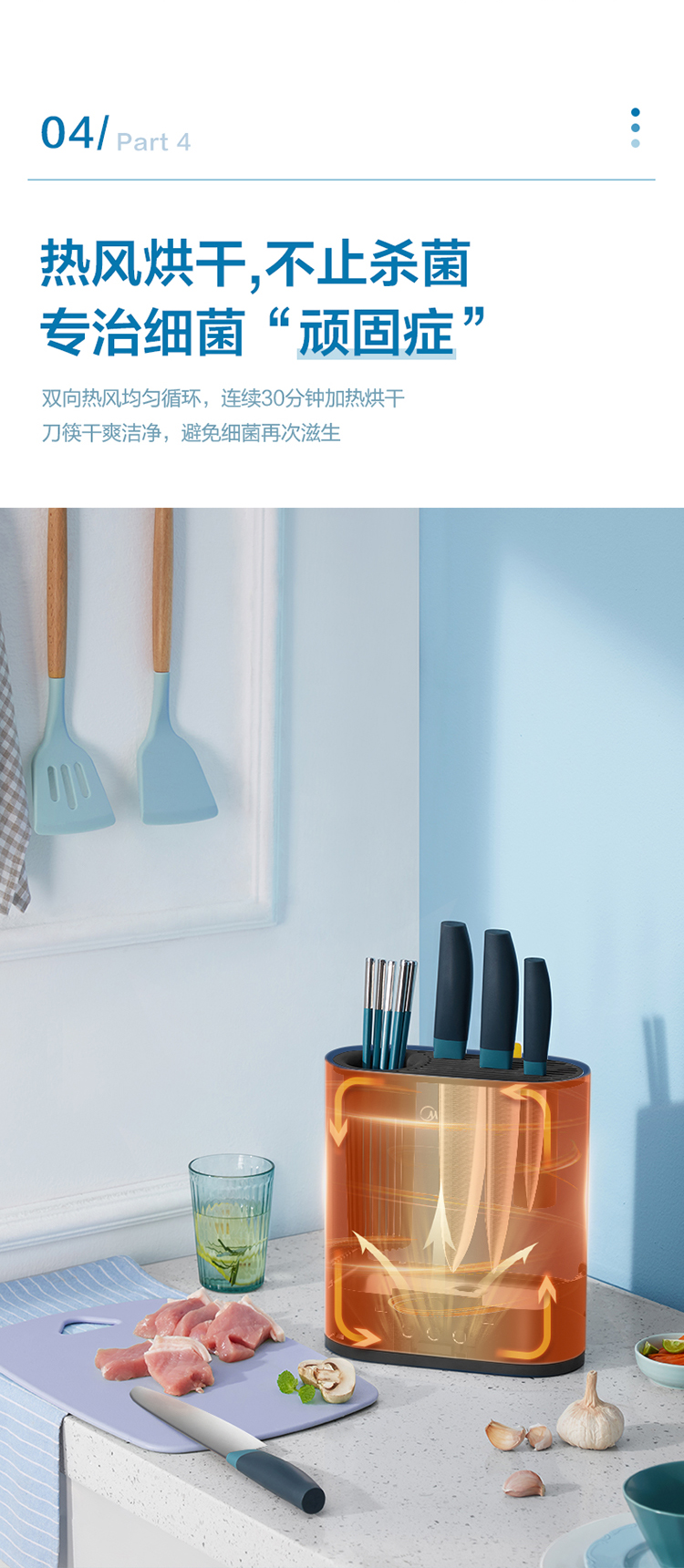 采用紫外灯管真消毒,其他竞品多为小灯珠消毒,功率和范围有限,不能达到>99.99%消毒。烘干温度达到75℃,其他竞品多为60~70℃,烘干不彻底。采用万用插刀设计,最多可装8把刀,13双筷子,6把勺子。采用先烘干再消毒程序设定,效率更高,同时带有4小时自动巡航功能,时刻保证刀筷干燥卫生。