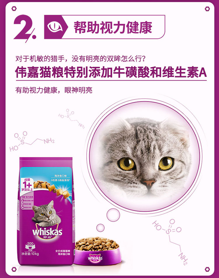 Whiskas 伟嘉是玛氏集团旗下的猫咪宠物食品品牌,这款猫粮全面均衡营养,0食盐0色素添加,猫咪吃着健康,富含锌和亚油酸,促进毛发健康闪耀,还特别添加牛磺酸和维生素A,有助于视力健康,眼睛明亮,酥皮卡滋脆,内含夹心,满足挑嘴猫咪。