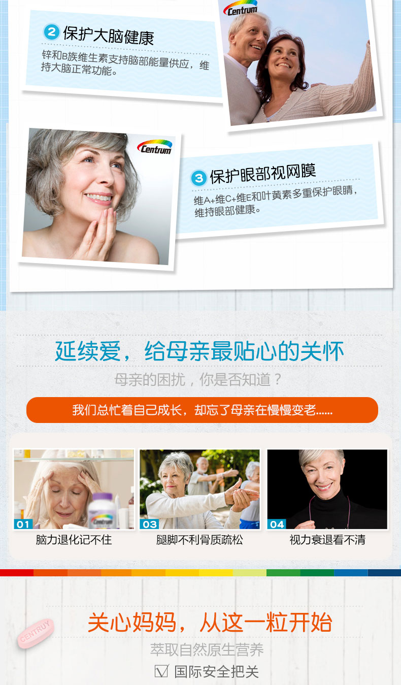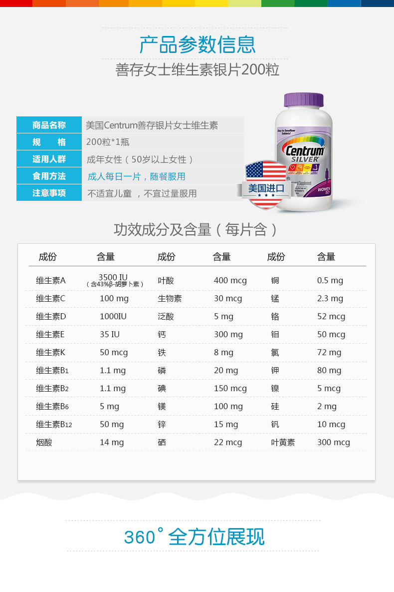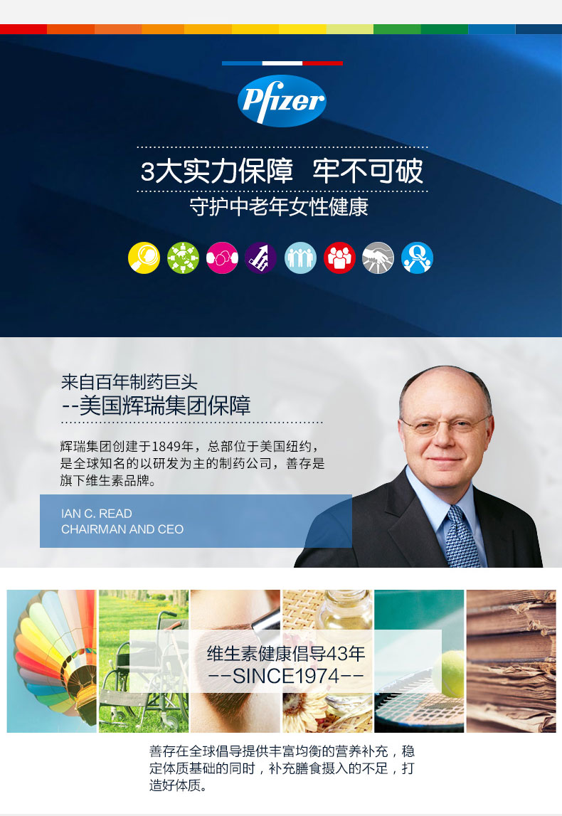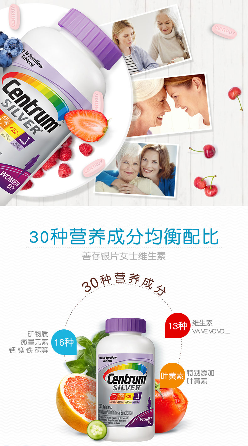 这款美版善存,专门为中老年女士定制,富含30种营养成分,13种维生素、16种B族维生素、科学配比,特别添加了叶黄素、维生素D+钙、叶酸+铁。含量精确计算,既满足每日所需,又避免某些维生素和矿物质过量可能产生的蓄毒问题。规格:200粒 每日1粒。