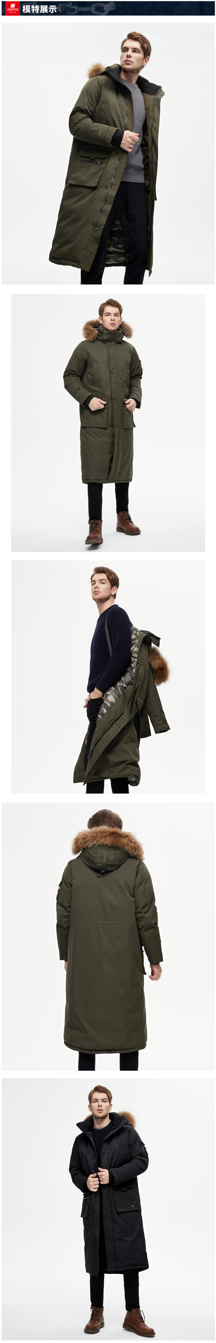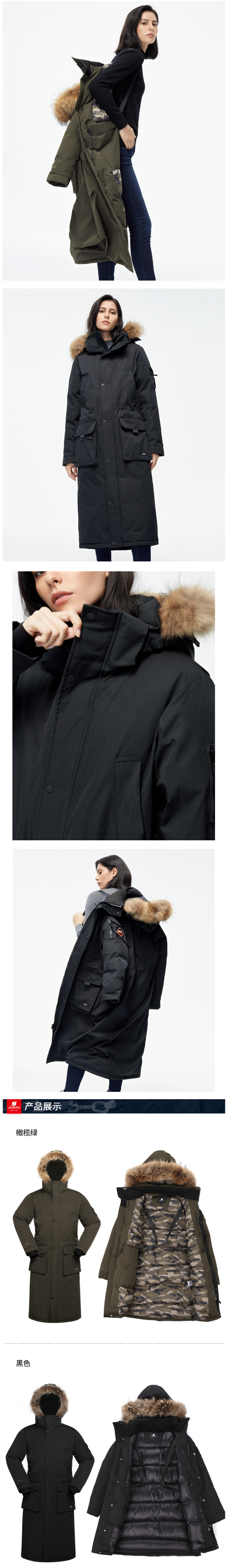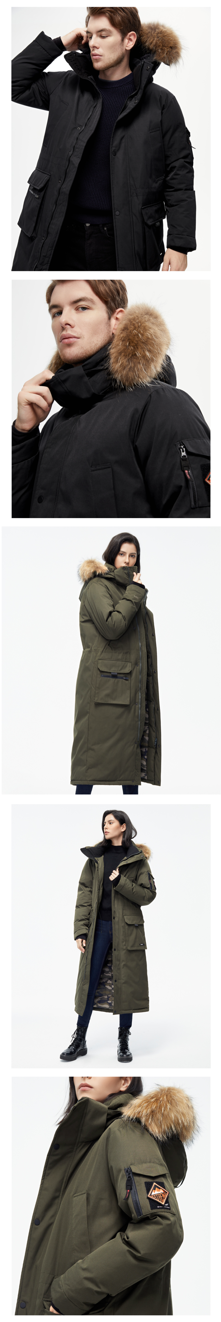 在款式和细节方面,修身版型,派克大衣风格,经典帅气。过膝长款(男款少见),连帽设计,帽檐一圈有用拉链连接的大貉子毛领(可拆卸)。3D全景调节可拆卸防风雪兜帽,搭配半高衣领,防止冷风倒灌入脖子。