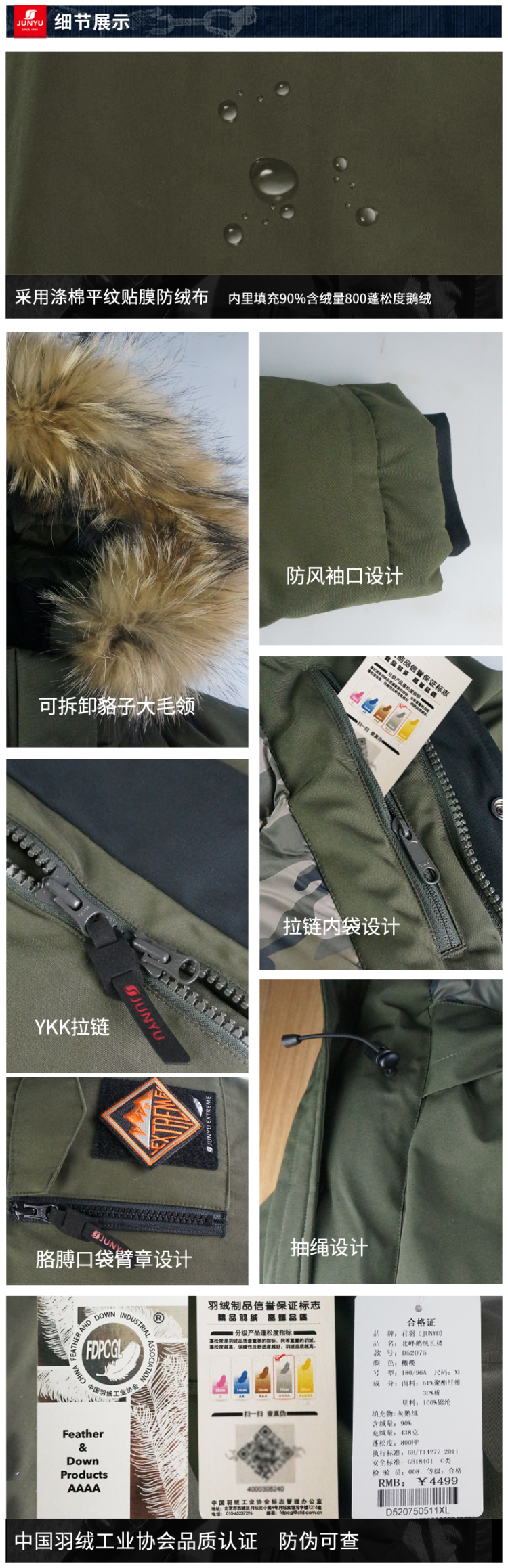 袖口内置保暖毛绒防风袖,保暖不倒灌风;双头主拉链和纽扣组合的双门襟,有着更好的保暖效果,所有拉链都是YKK的,防风保暖袖口,帽子用魔术贴调节前后幅度。