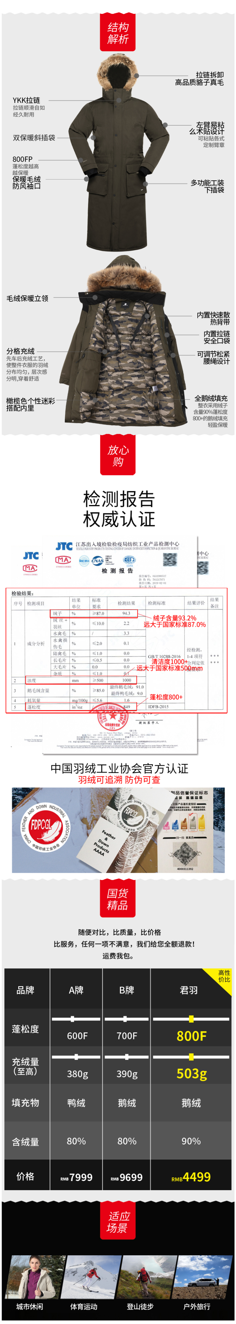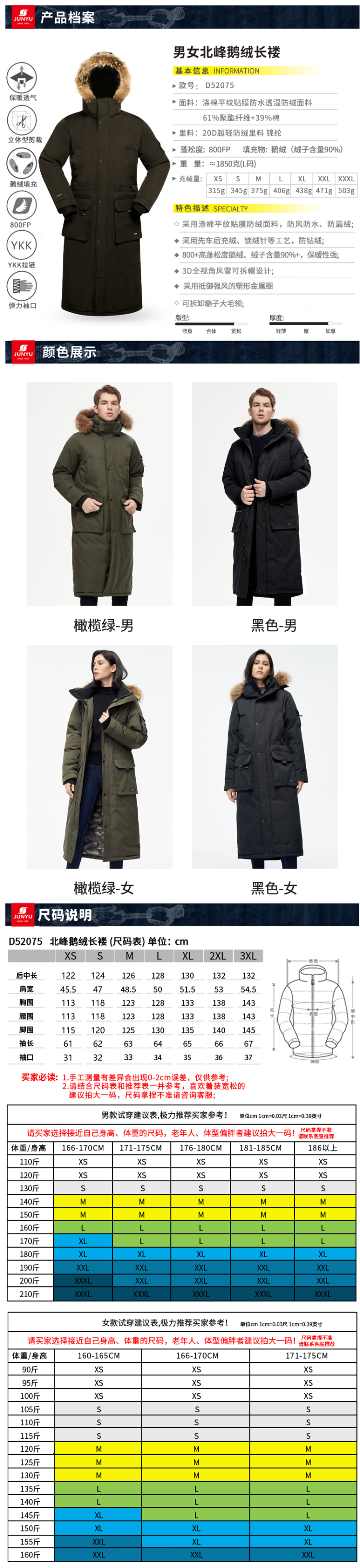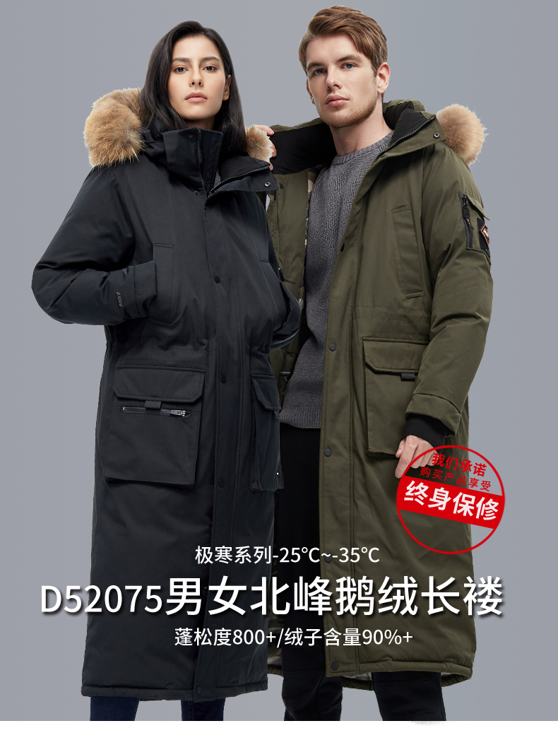 这款君羽北峰长款羽绒服,属于极寒系列,可抗-25℃~-35℃,是2020年的冬季款,内里填充了800蓬90%鹅绒,L码充绒量375克,属于超重装羽绒服了,外层是涤棉平纹贴膜防水透湿防绒布,可挡风防雨雪透气;内层是20D超轻防绒锦纶,防钻绒。