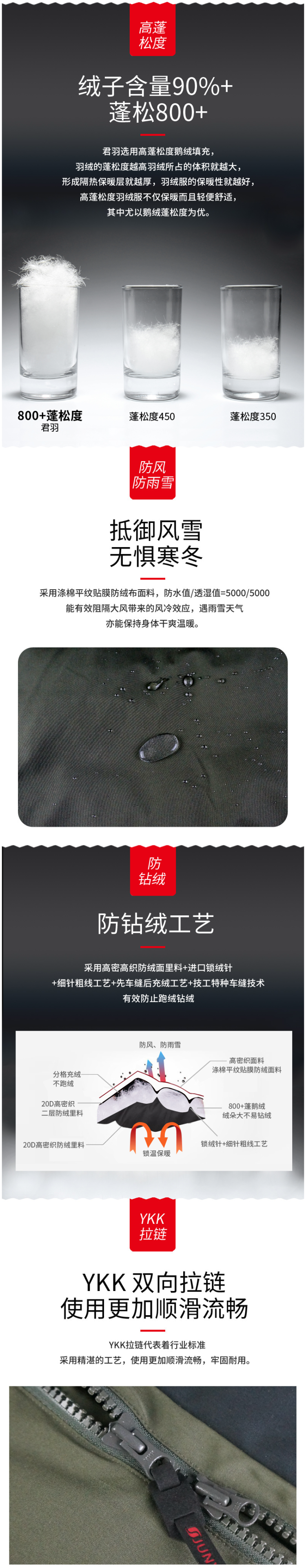 「防钻绒处理」面料与填充的羽绒,使用先车出羽绒隔舱,后充绒的方法,在制作外层面料过程中,羽绒隔舱就预先织出来,后填充羽绒,这样可有效避免羽绒从针眼钻绒。