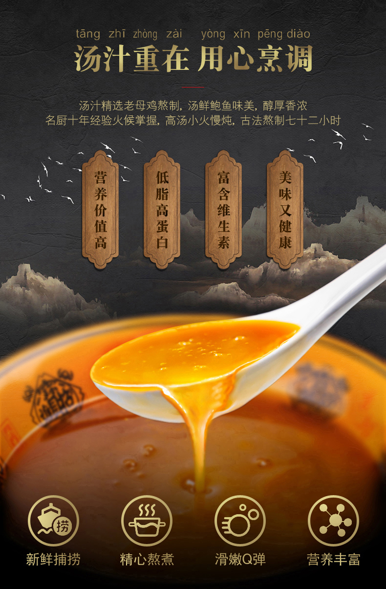 这款鲜伴 即食鲍鱼罐头,采用北纬37°的深海鲍鱼,无明显腥味,鲍鱼肉厚鼓壮饱满,鲜嫩软滑,利于消化;搭配七十二小时熬制的老母鸡汤,汤鲜鲍鱼味美,醇厚香浓。