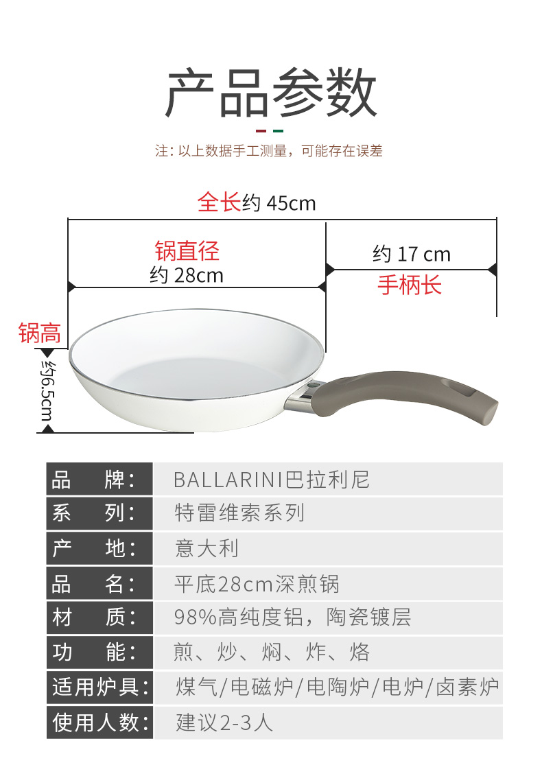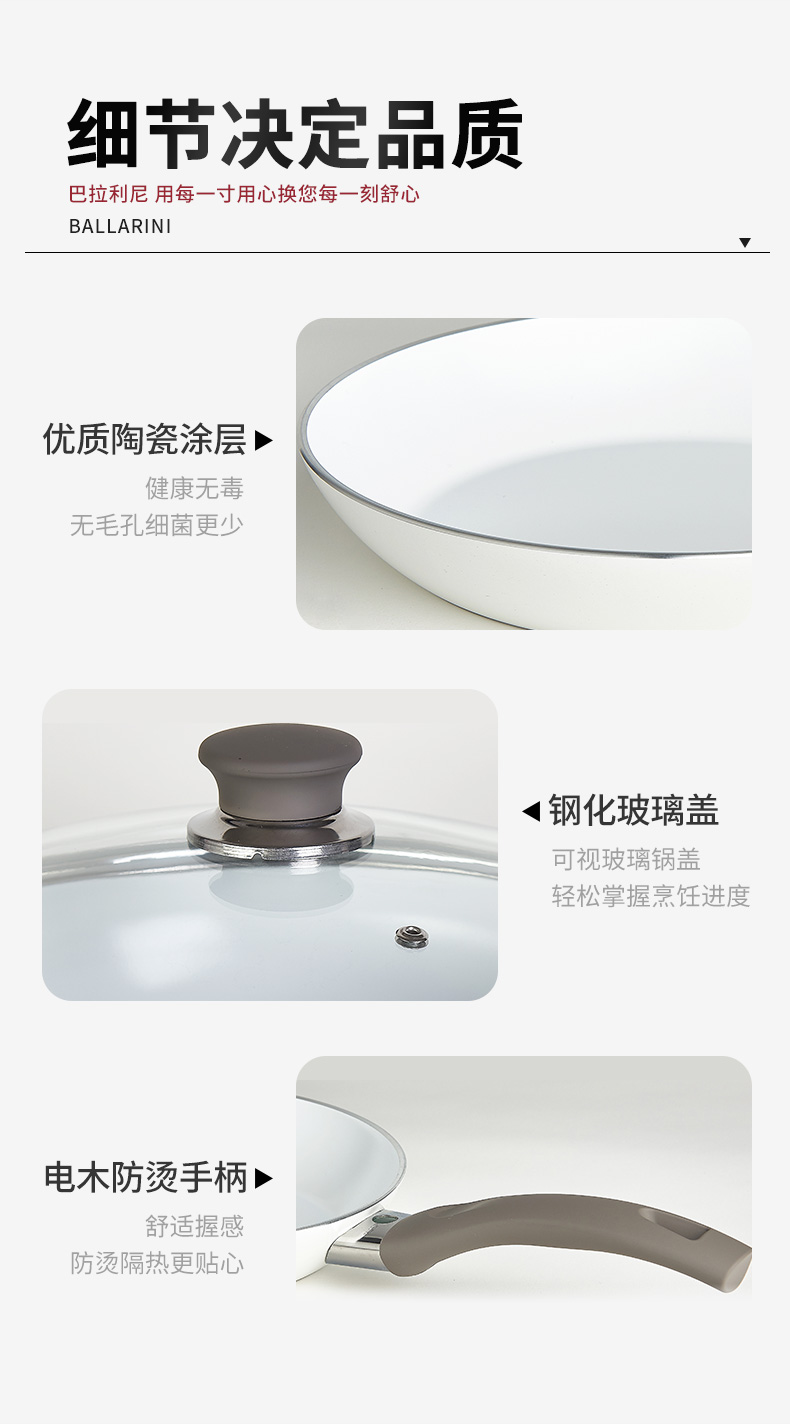 这款巴拉利尼 陶瓷不粘炒锅,意大利原产,锅口直径为28cm,深6.5cm,主体是98%高纯度铝,内里采用陶瓷不粘涂层,非化学涂层无毒,高温无有害物质析出,无毛孔更少细菌残污,在无油情况下煎蛋,锅面也不粘。