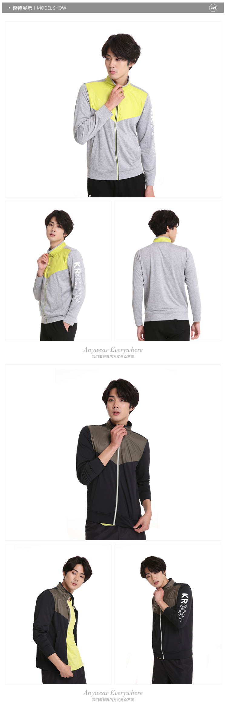 在款式方面,标准版型,因为面料带有弹力,稍微胖一些的人也能穿。胸前是梭织拼色设计,加上左袖子上大大的KROCESU的Logo,避免衣服太单调,增加了点休闲气息。