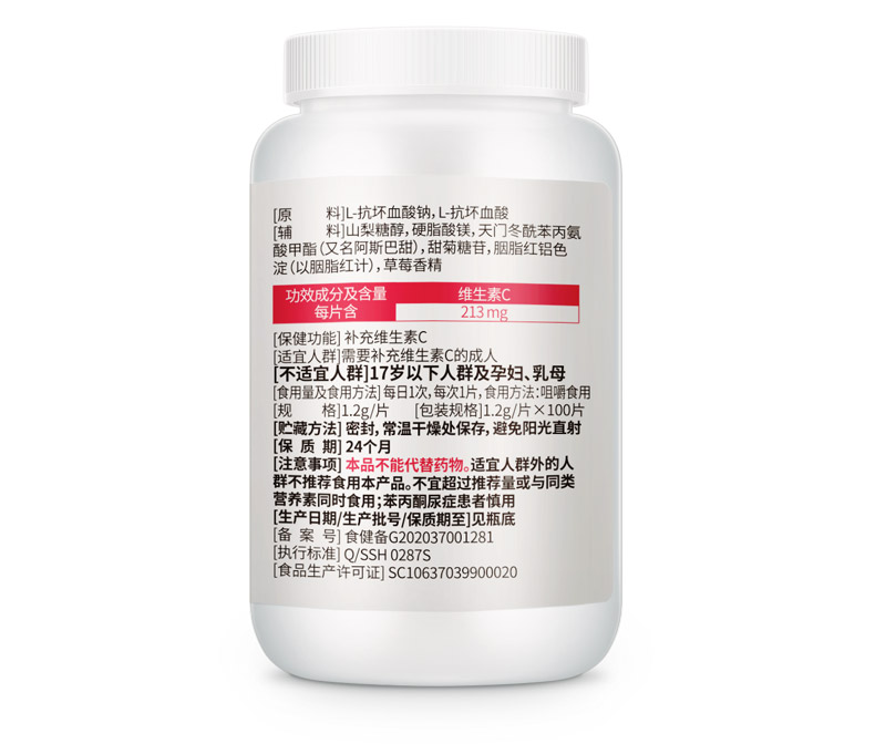 这款康恩贝 维生素C咀嚼片,每片当中有维生素C 213mg,适合经常运动、骨骼牙齿不健康、体质弱、长期抽烟喝酒等人群。不适宜婴幼儿、少年儿童、孕妇、乳母,每日1次,每次1片,咀嚼食用。