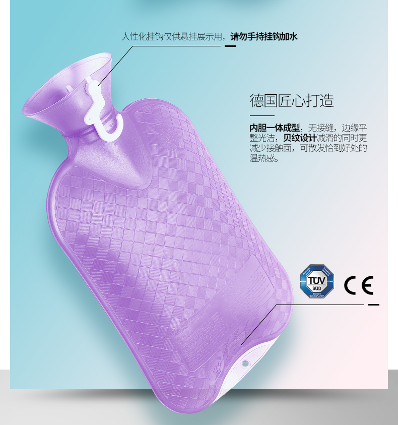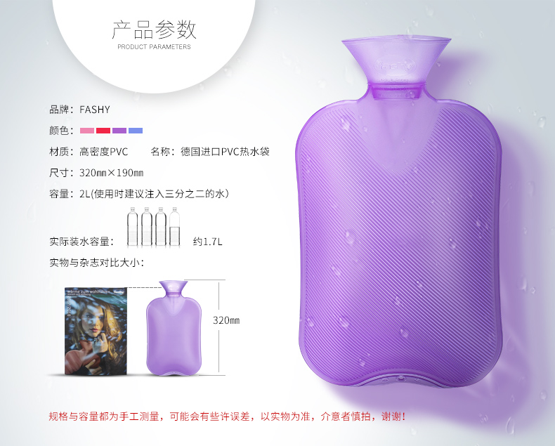 这款费许Fashy热水袋,容量是2L, 除了装热水,还能装冷水。采用德国进口的PVC材质制成,散热均匀,清洗不变形,没有异味,使用寿命长达5-10年;热水袋的外层是格子设计,减滑的同时还可以减少接触面积,提供舒适的温度;