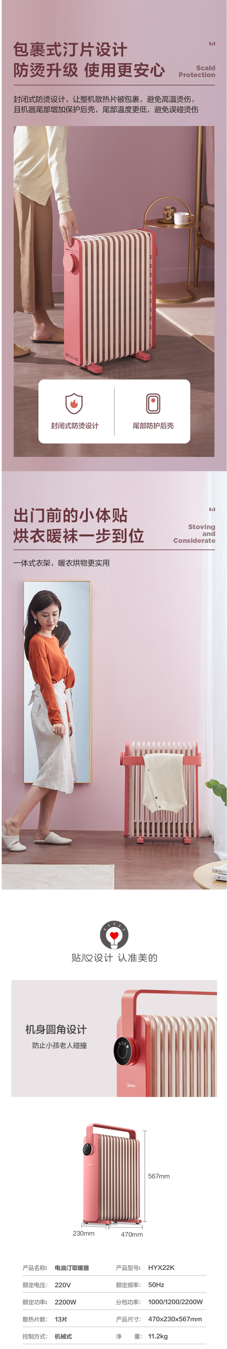 这款美的电热油汀取暖器,166mm加宽油汀片,13片油汀同时升温,创新鱼骨油路速热设计,配合烟囱散热风道,散热面积更大,提高了热效率,制热速度更快,使用寿命更长。