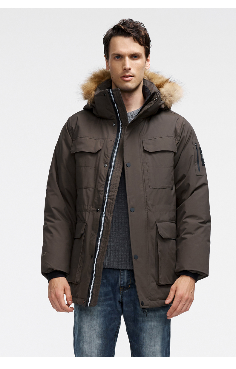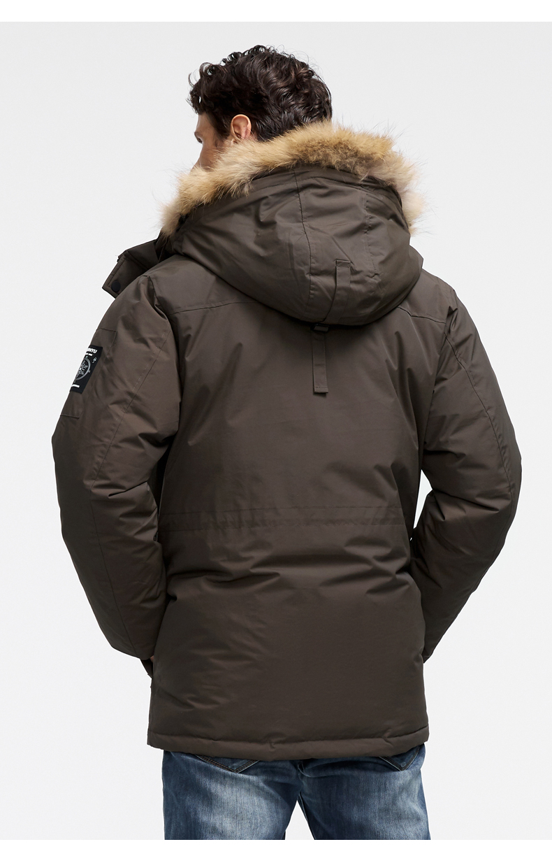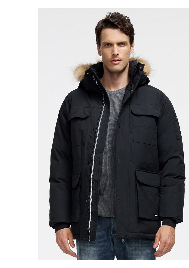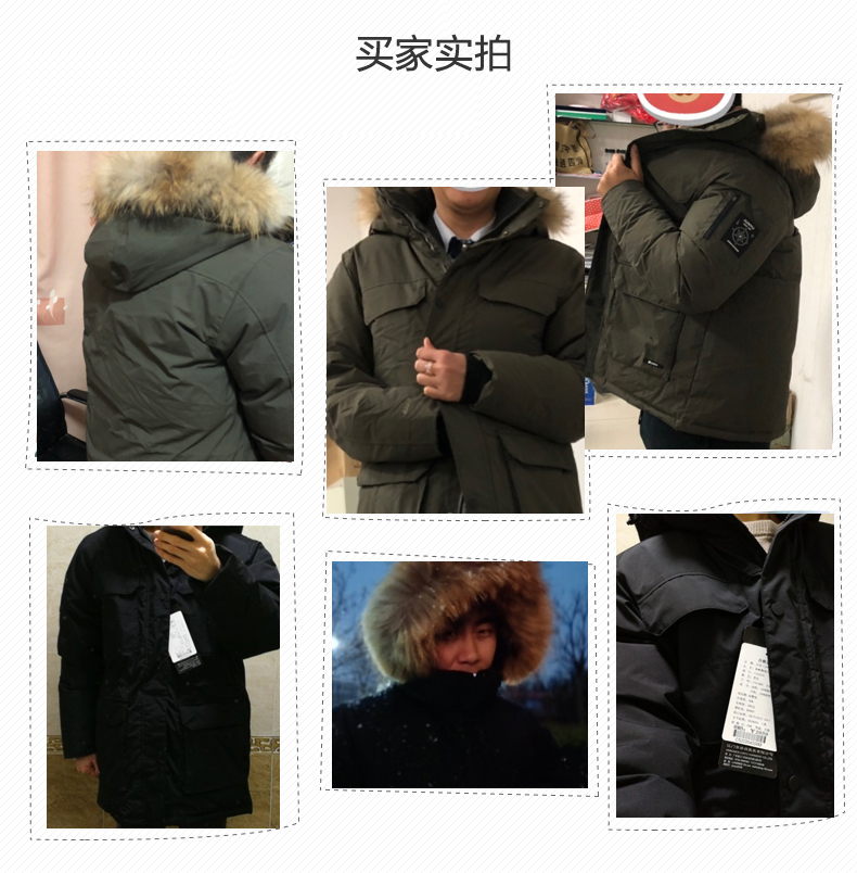 这款君羽寒峰男中长款羽绒服,属于极寒系列,可抗-30℃~-40℃,是2018年的冬季款,内里填充了800蓬90%鹅绒,L码充绒300克,属于超重装羽绒服。外层是高密度耐磨锦纶布,伴有压胶加持,可防风防雨雪。工装风款式,长度过臀及大腿。