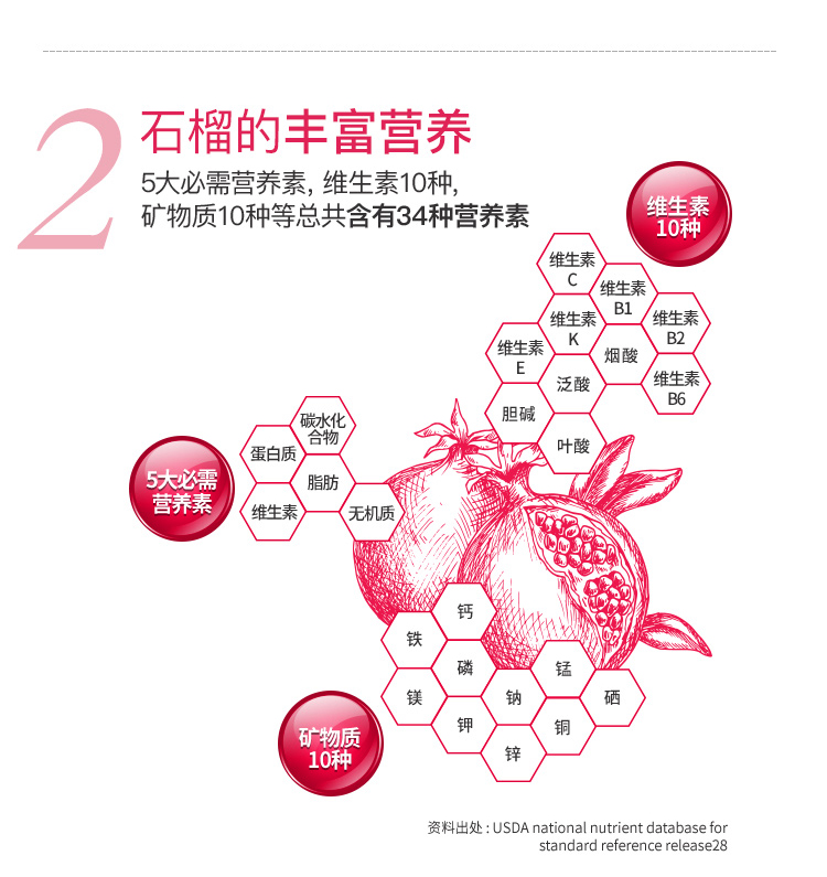 红石榴:采用土耳其原产红石榴浓缩成汁,除了含有丰富的维生素B1、B2、VC和和矿物质元素外,还含有石榴多酚、安石榴苷、原花青素、车矢菊素、花色苷等多种有助于皮肤健康的,抗氧化、抗衰老成分。