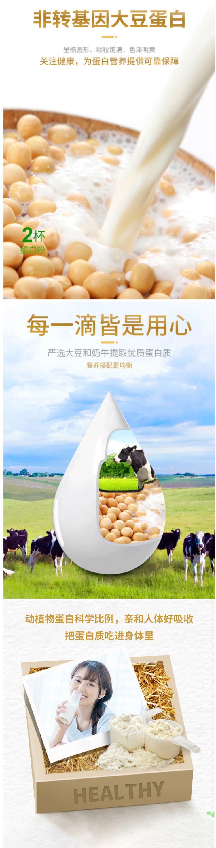 采用天然大豆蛋白与乳清蛋白双蛋白组合,植物蛋白与动物蛋白5:1的科学配比,含有丰富的人体所需氨基酸和多种营养活性成分,相互补充作用,更加容易吸收,为身体提高活力,补充营养,增强免疫力。适合3岁以上所有人群。
