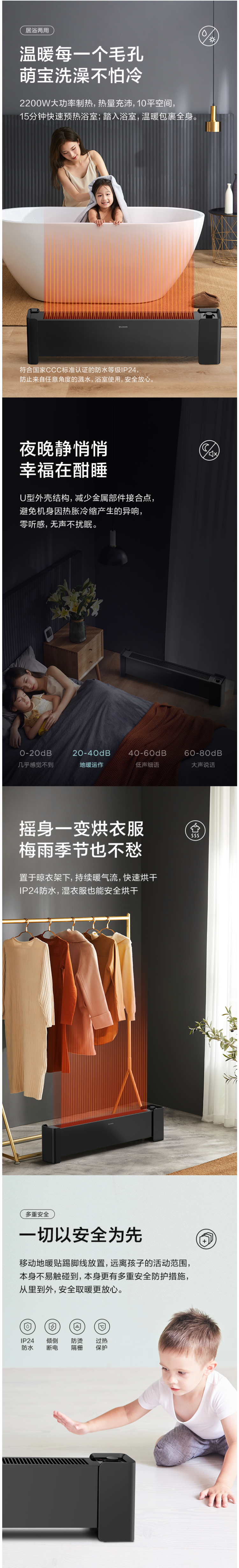 共有5重安全防护,首先是童锁功能,不用担心宝宝碰到控制板;其次是IP24级防水,实现防溅水防泼水防尘;还有过热保护,在使用过程中,当机器表面温度升高到75℃左右会自动恒温;当本机使用斜角度大于45°或跌倒时,自动关闭电源;出风口的格栅间距小,有效防止儿童手指伸入。